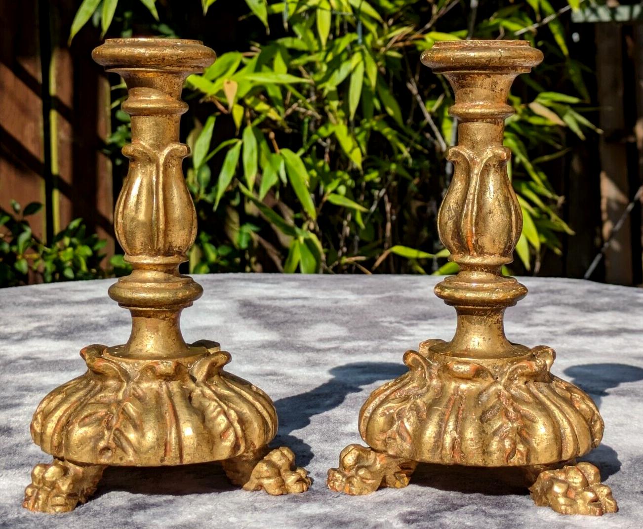 19th Century Pair French Carved Gilt Wood Claw Feet Antique Candlestick Holders