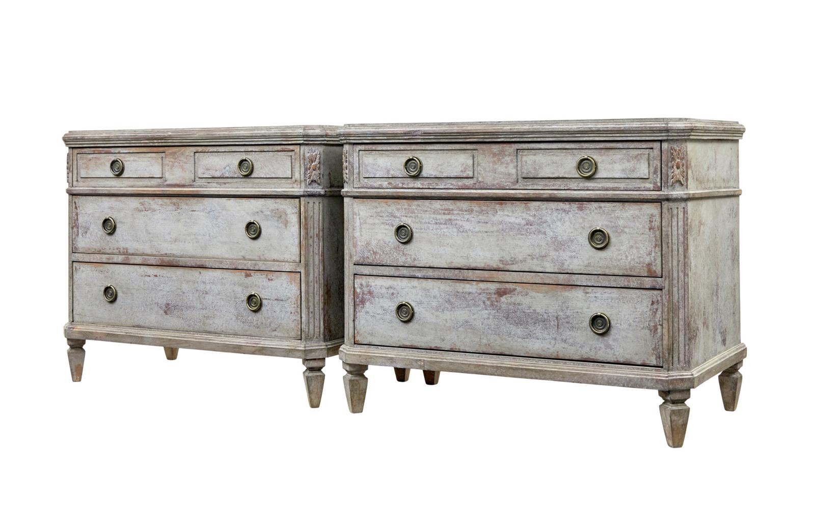Scandinavian pair of painted pine commodes, circa 1870. Stunning pair of swedish chests, very much in the gustavian taste. Generous proportions allow elegance and maximum storage around the home. Rectangular top with canted corners, further embellished with a stepped moulded edge around the top surface. Shallow top drawer with inset fielded panels, with a further 2 deep drawers below. Scraped back paint with later paint applied over the top, which has now become faded, even wearing back to the bare pine grain in places. Each standing on 4 short tapered legs. Later ornate brass handles fitted. Obvious minor surface marks to woodwork and fading/losses to paintwork. Strong and sturdy, ready for everyday use.