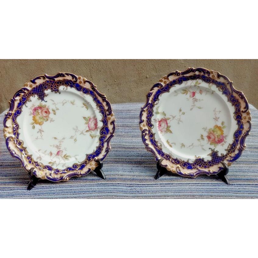 19th Century Pair Scalloped & Moulded Cobalt Blue Gilt Porcelain Antique Plates