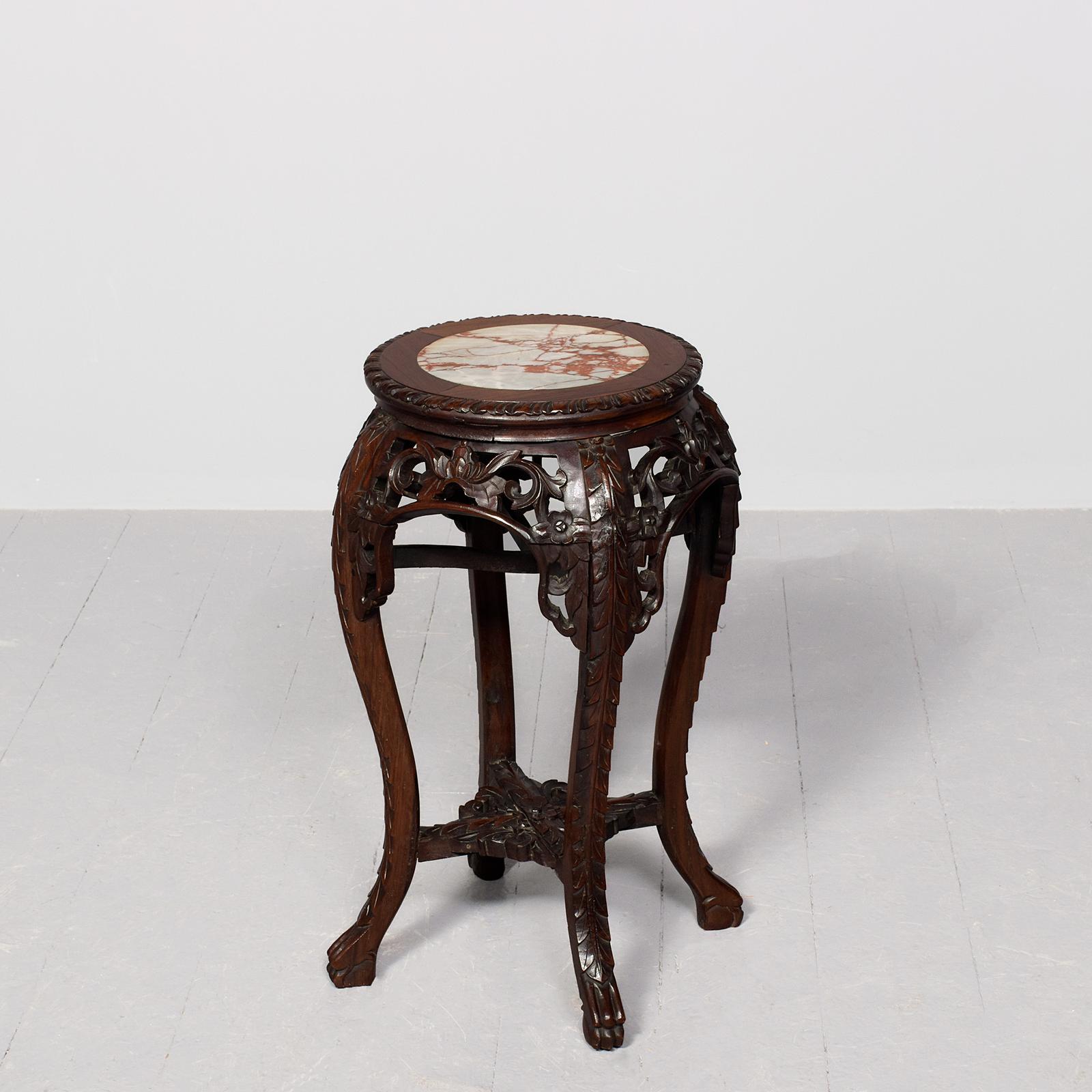 Circa 1890. Quality late 19th-century Qing dynasty Hongmu Marble Top Plantstand. The circular top with fluted edges and a grey and burgundy flecked marble inset over an open, foliate-carved frieze. Supported on foliate carved cabriole legs with a lower fretted stretcher. In excellent order
