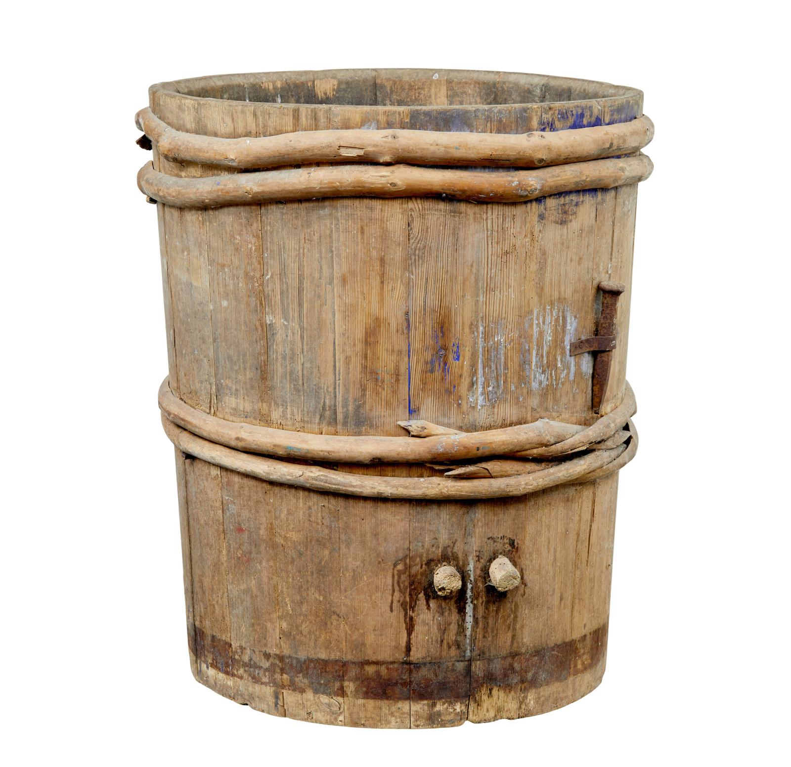 19th century rustic swedish pine barrel circa 1850. Fantastic opportunity for a piece of up cycling with this piece of rustic swedish woodwork. Likely to have been made and used for storing grain in, slightly tapered pine planks bound by naturally formed branches which have been shaped to encase and strengthen the structure, and an iron nail fitted to the side. Traces of original blue paint to the outside. Perfect opportunity to be made into a hot tub/bath with some internal resin coating. Natural patina has been maintained on the outside. Evidence of dead inactive worm. old repairs to underside of base and 1 hole, which could be an opportunity to convert that into a plug. minor losses and expected fading.
