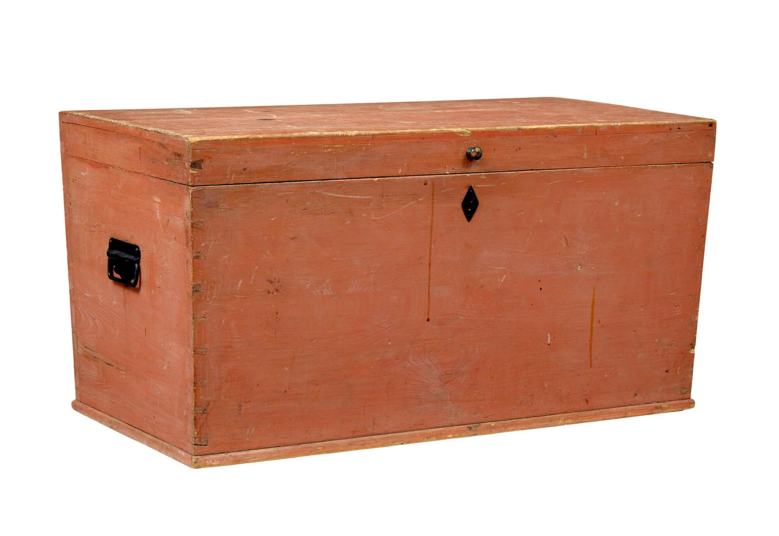 19th century scandinavian pine flat top trunk circa 1890. Practical piece of everyday swedish furniture. shaped chest, painted into a brown/orange scheme. black painted side carrying handles and hinges. no working lock or key. Lid opens to a plain un painted interior with plenty of room for storage. lends itself well to being used as a coffee table with the flat top creating the ideal surface. Expected minor no structural age splits and surface marks and fading to painted surface.