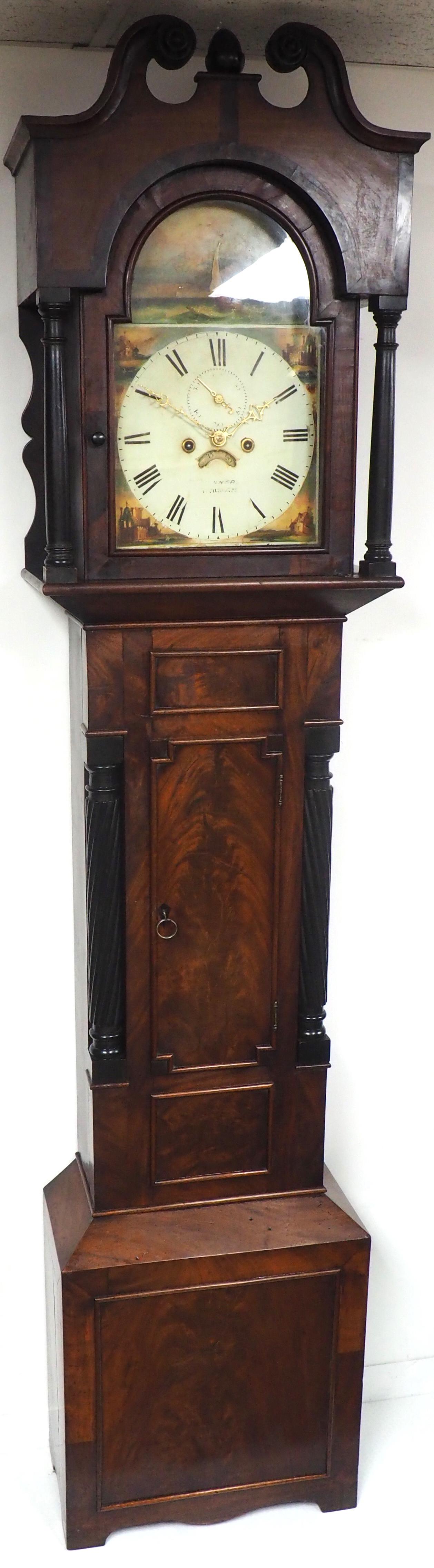 19th Century Swan Neck Pediment Longcase Clock Galleon painted arched dial 8 Day Movement Gloucestershire clock