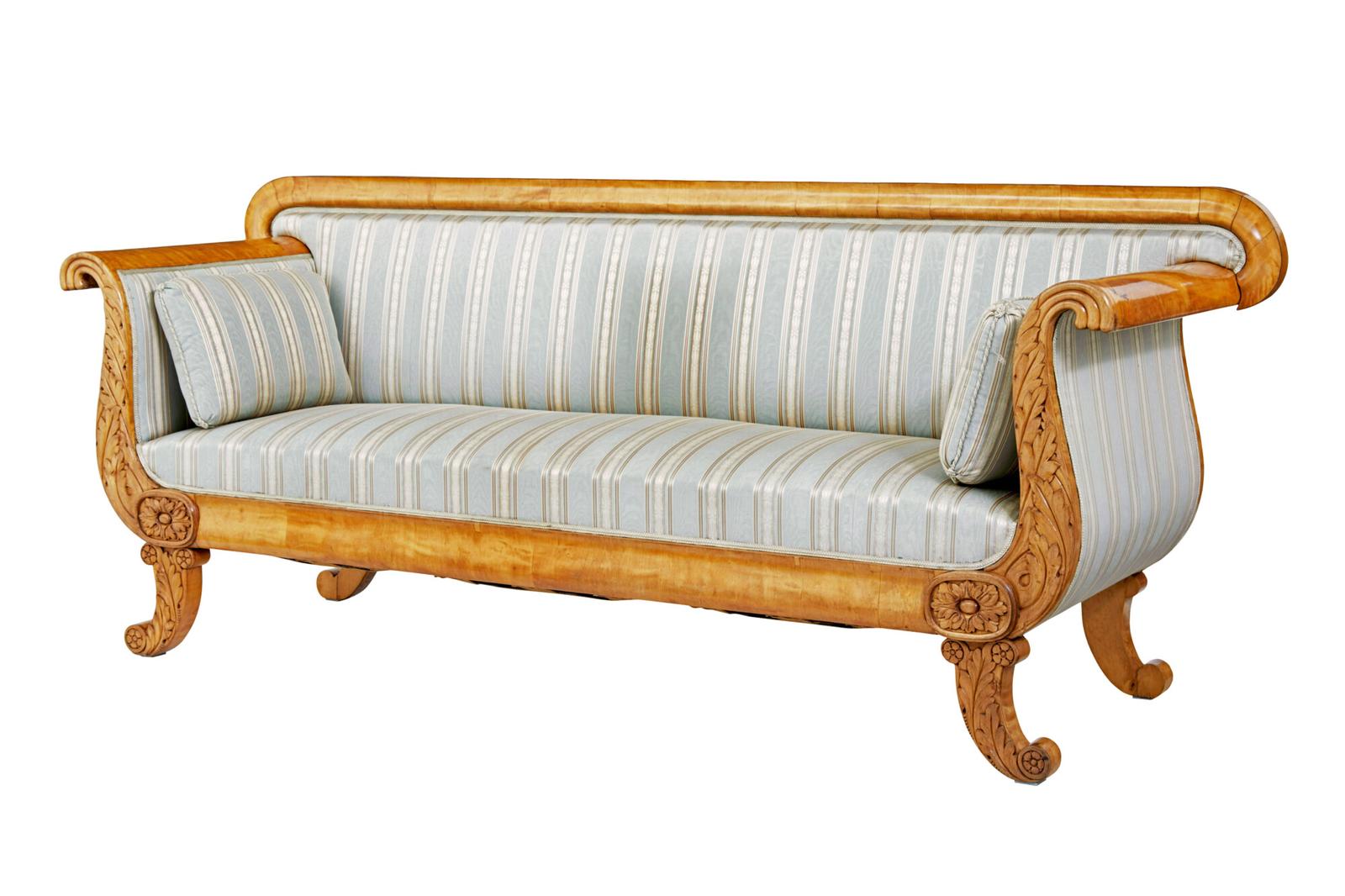 19th century swedish carved birch sofa circa 1880. Elegant swedish formal sofa which seats a comfortable 3.   straight back with shaped birch border.   roll top arms with carved acanthus leaf detailing flowing down to the applied carved plaque above the foot.   standing on 3 carved scrolling legs. Upholstery is in usable condition with some natural daylight fading to the centre. (please see pictures)  complete with 2  cushions.   covering has recently been professionally cleaned. Expected minor surface marks to woodwork and minor repairs to veneer.