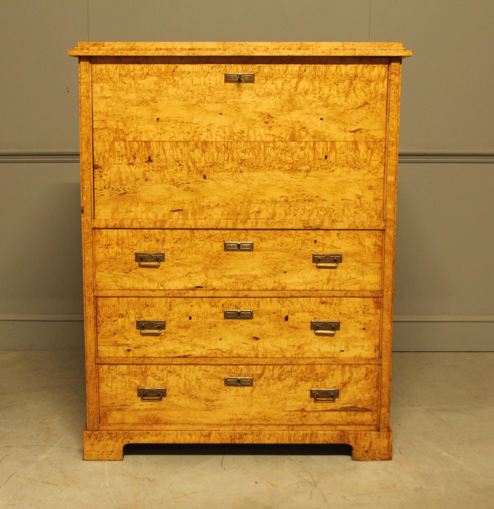 A beautifully restored 19th‑century Swedish Masur birch secretaire, showcasing the highly figured, shimmering grain that defines true masur birch. The piece offers three deep lower drawers and a pull‑down fall front with working key, opening to reveal ten interior drawers and a central locking cupboard. Every element has been restored by hand, with all drawers running smoothly and the whole piece finished with a rich wax polish.