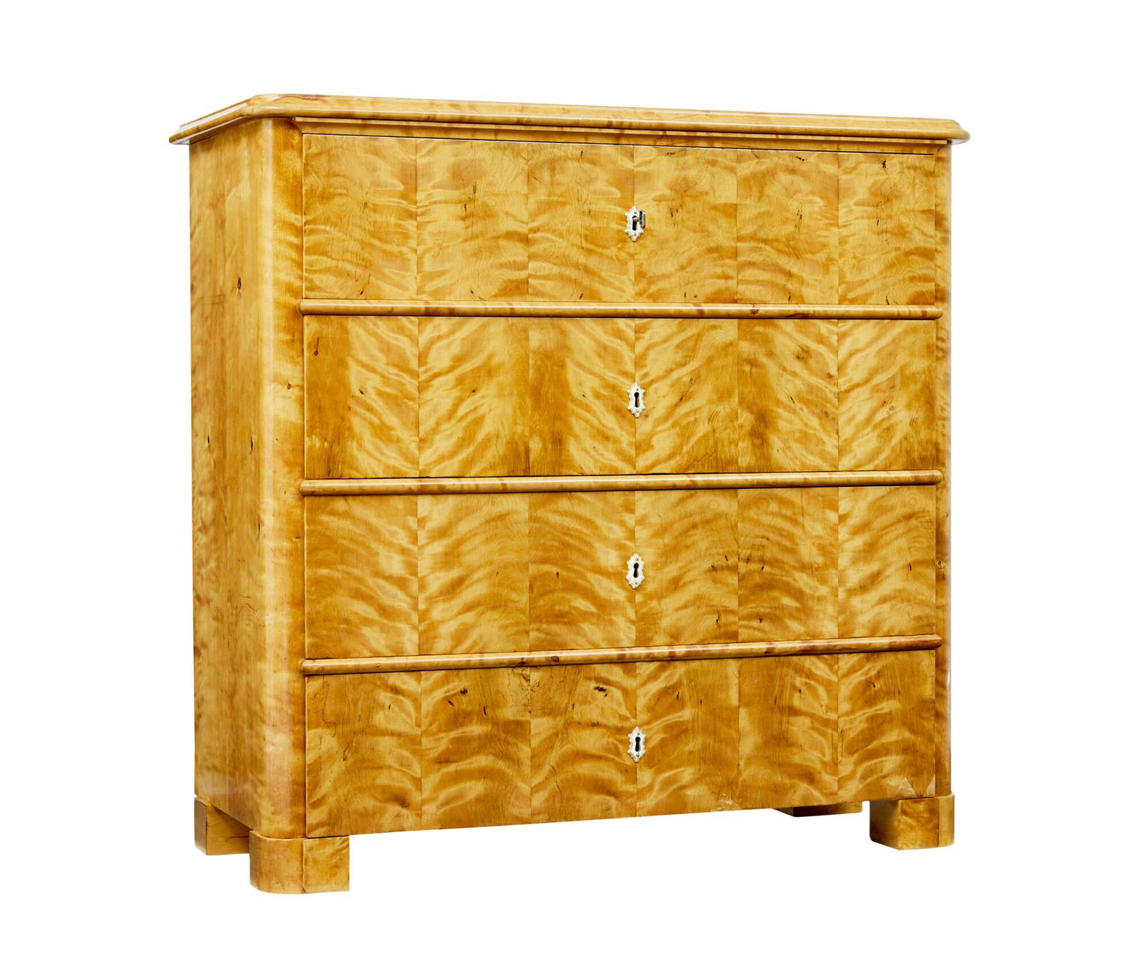 Stunning 19th Century (circa 1870) Swedish antique tiger birch chest of drawers (4 drawers) veneered in a tiger birch which gives it's striking finish. Slightly over-sailing top with moulded edge and rounded front corners. Chest is fitted with 4 drawers of equal proportions which open on the key. It is normal for Scandinavian furniture of this period not to have handles or knobs, but could be retro fitted if desired. Beaded edge fitted in-between each drawer. Raised on 4 shaped block feet. Areas of restoration to woodwork to bottom drawer and each lower side, this has been done in near matching timber which wasn't easy to source. Expected minor surface marks and fading. Completely re-polished by hand in our workshop and ready for everyday use.