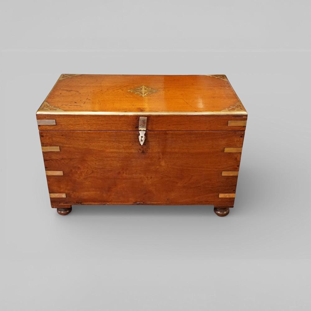 This handsome 19th-century teak campaign trunk is a fine example of functional yet decorative military furniture, designed for durability during travel while retaining strong aesthetic appeal. Crafted from solid teak, the trunk displays a rich, warm tone and excellent grain, prized for its strength and resistance to movement—ideal for campaign use.