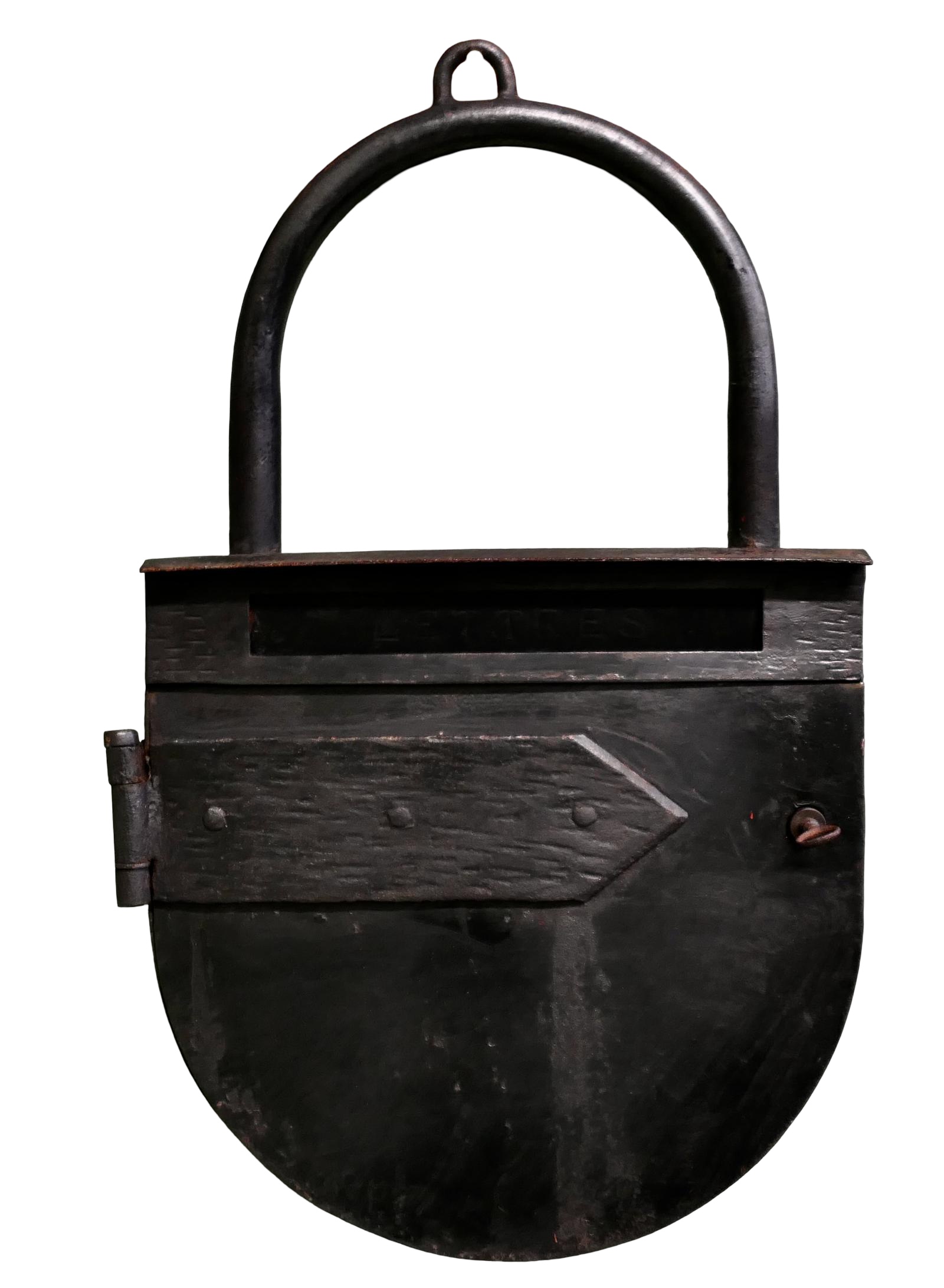 The Post Box is a very unusual piece, it is blacksmith made to hang outside a Hardware shop, it is in the shape of a padlock. On the front there is a slot for letters and below this a lockable door flap to take them out.