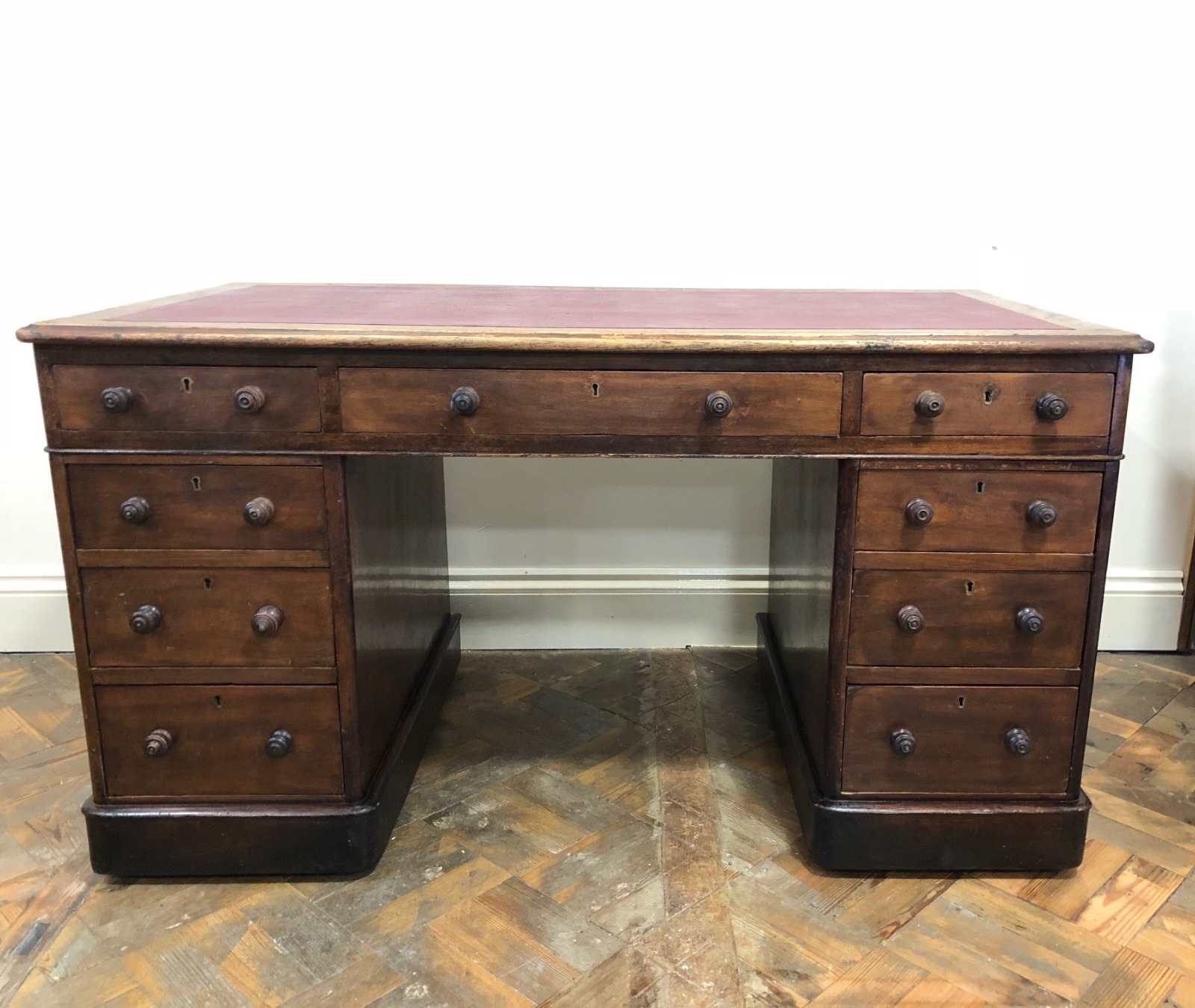 19th Century Twin Pedestal Kneehole Desk with Red Leather Top (1 of 1)