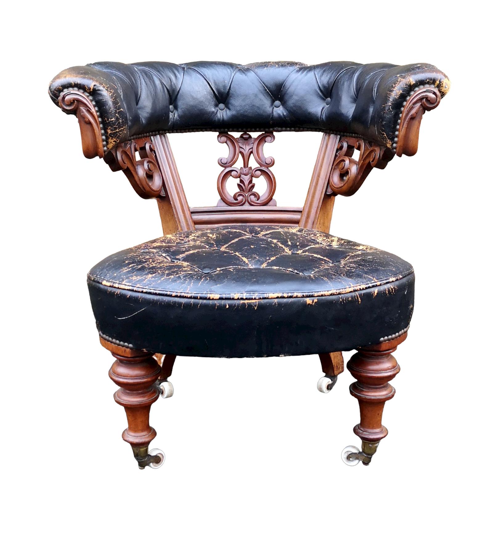 19th Century Victorian Walnut & Leather Upholstered Chair