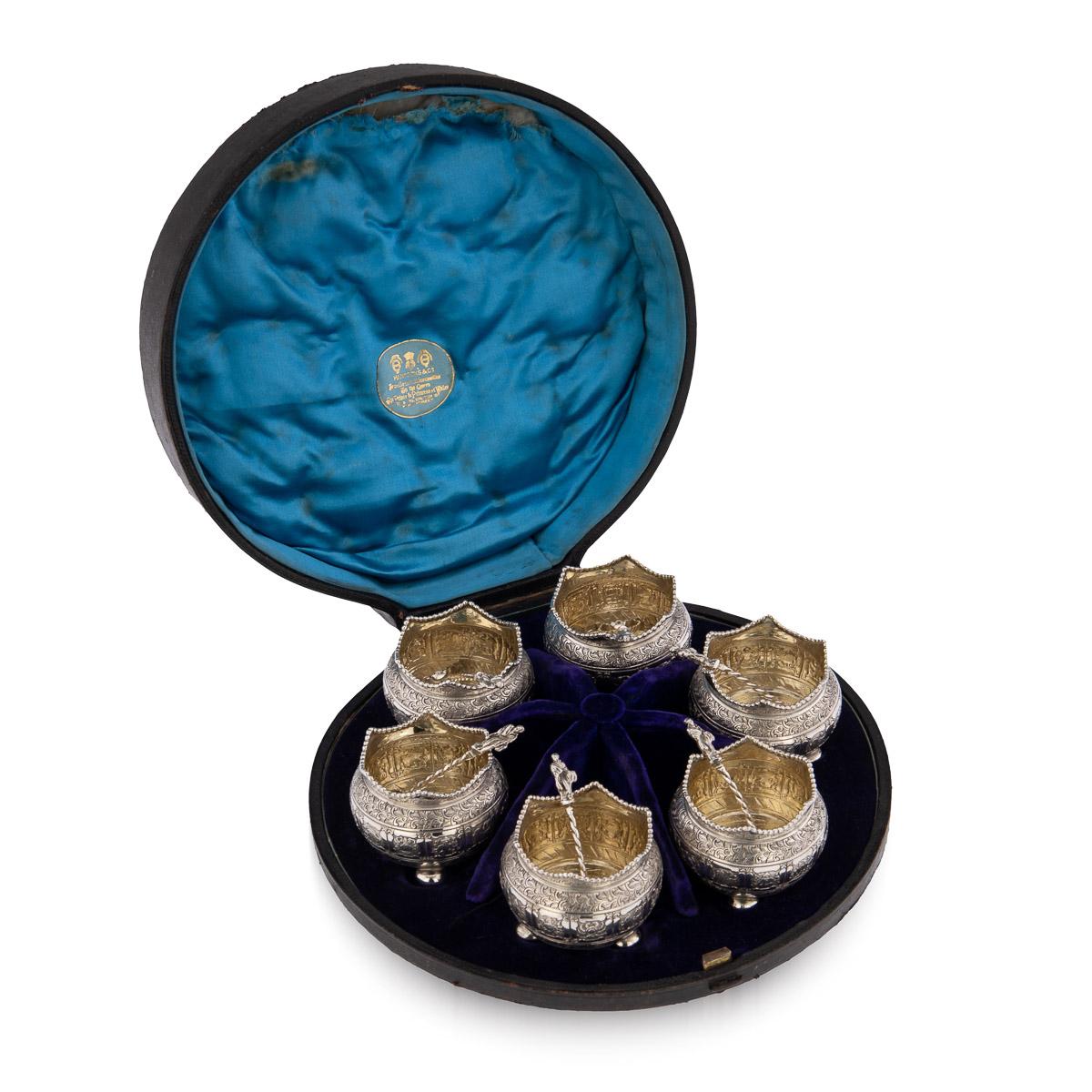 19thc Victorian Solid Silver Set of 6 Salts & Spoons, London c.1876