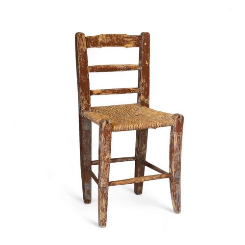 This example is constructed in ash - a strong, flexible timber - with continuous back uprights, a simple ladder‑back, and hand‑shaped stretchers. The layers of paint, applied and worn over decades, give the chair a depth of colour and texture that only time can create.