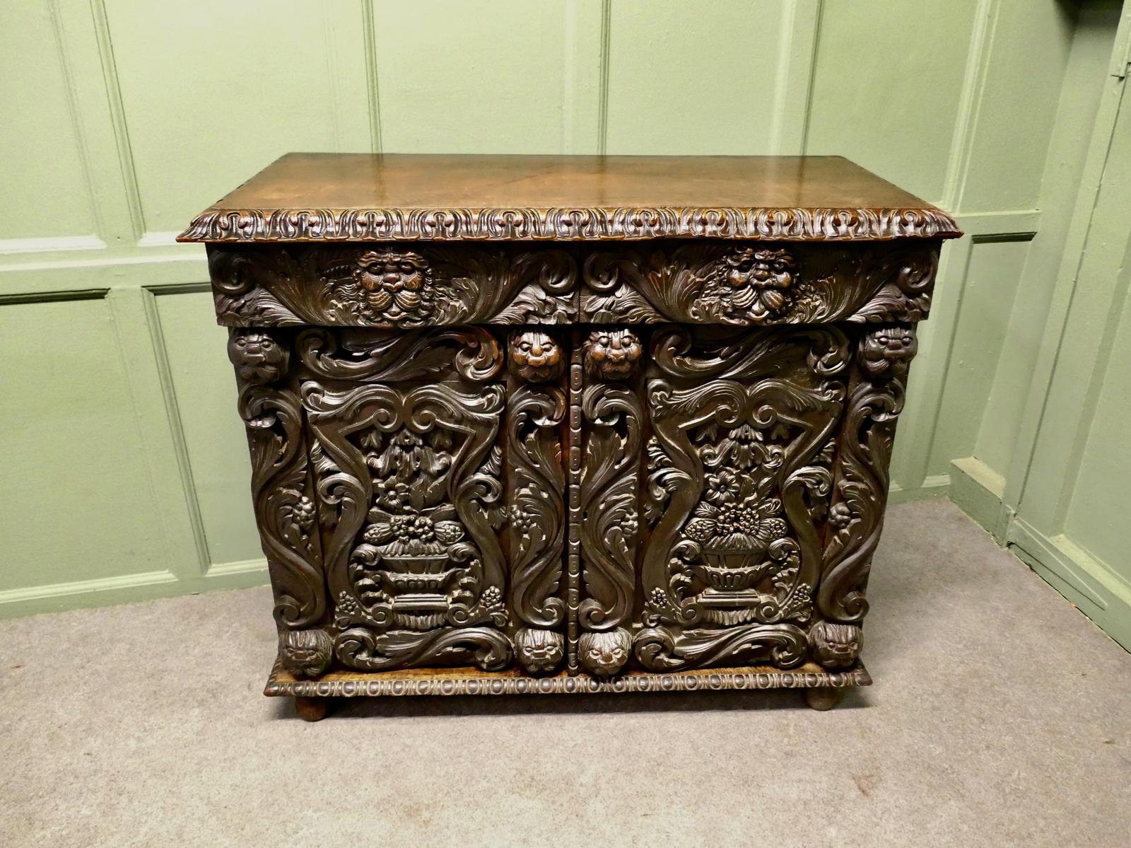 2 Door Carved Gothic Oak Cupboard, Sideboard This is an unusual design, the cupboard doors and drawer fronts are profusely carved in the Gothic oak style, with faces including the green man, vines and scrolls. This is a sturdy little cupboard with 2 drawers and a shelved cupboard, it is in good antique condition. The sideboard is 36” tall, 39” wide and 39” deep Ref: DG53