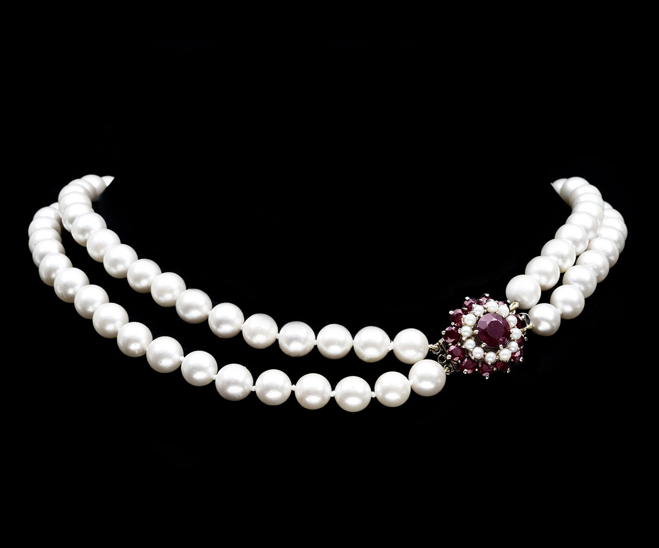 2 Rows of Cultured Pearls with Garnet & Pearl Clasp Circa 1955