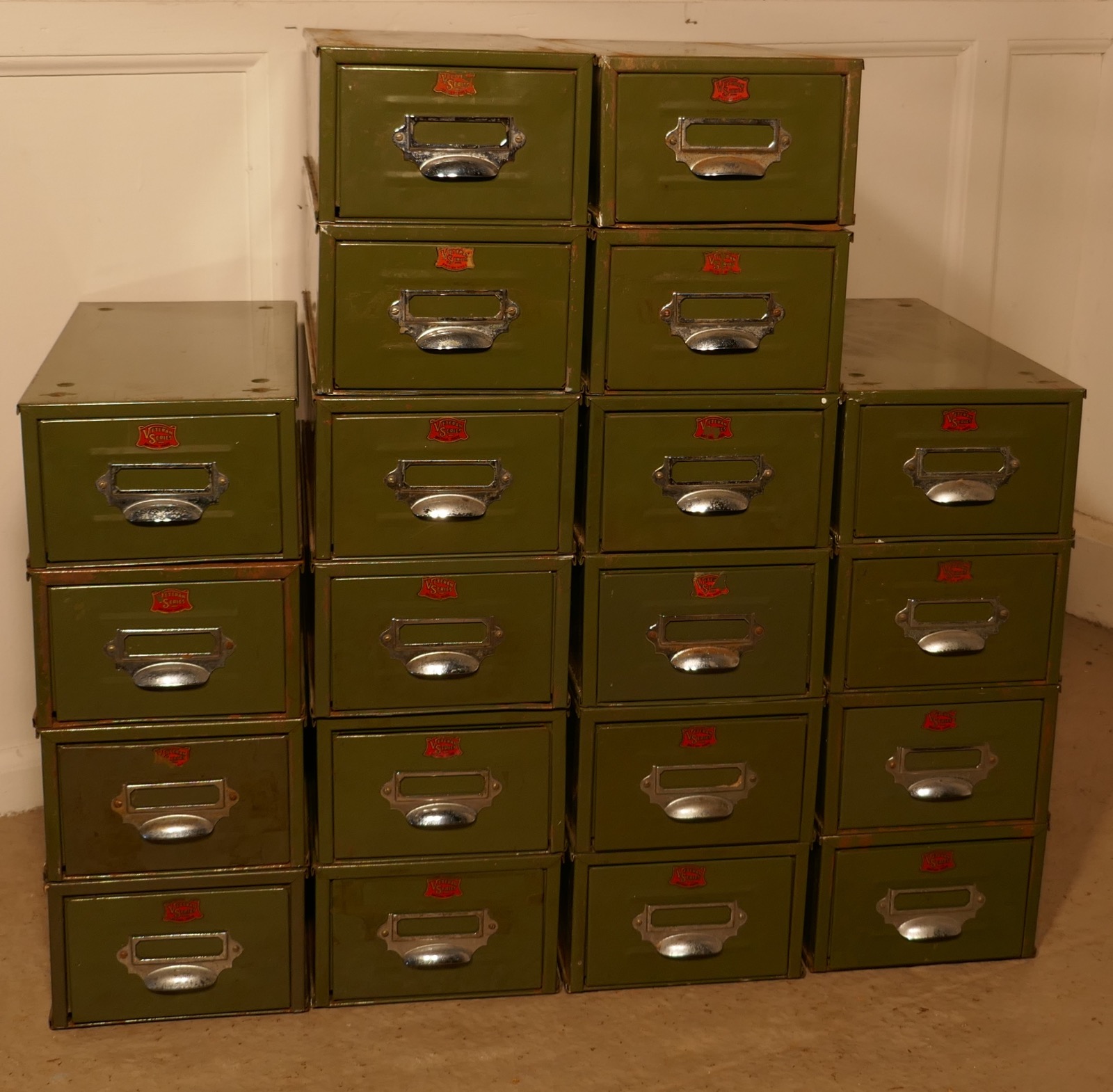 20 “Veteran Series” Green Metal Filing Drawers Card Index, Adjustable Stackable