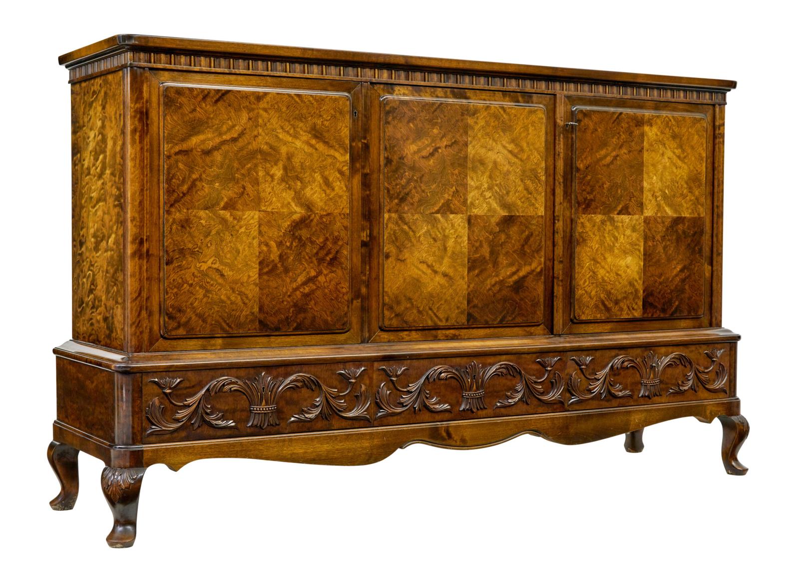 Stunning karelian birch sideboard made by smf bodafors. Beautiful colour and burr birch veneers used on this piece. 3 doors to the front providing a double door and a single door cupboard, each with quarter matched veneers.   interior with 2 adjustable shelves. Below the cupboard are 3 drawers which open on the key, all decorated with applied carvings. Standing on short cabriole legs with carved acanthus leaves. Minor surface marks. Very slight rippling to veneer on top surface in 1 area.