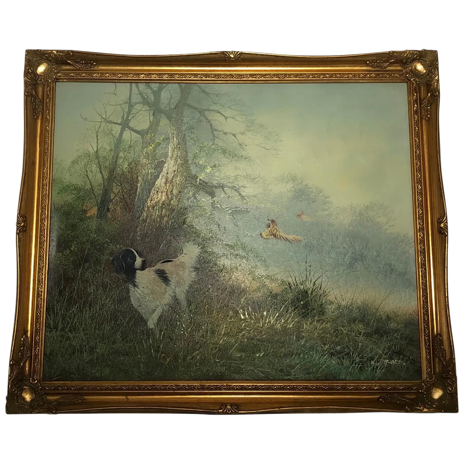 20th Century English Oil Painting Hunting Setter Dog & Pheasants in Flight L Eiford