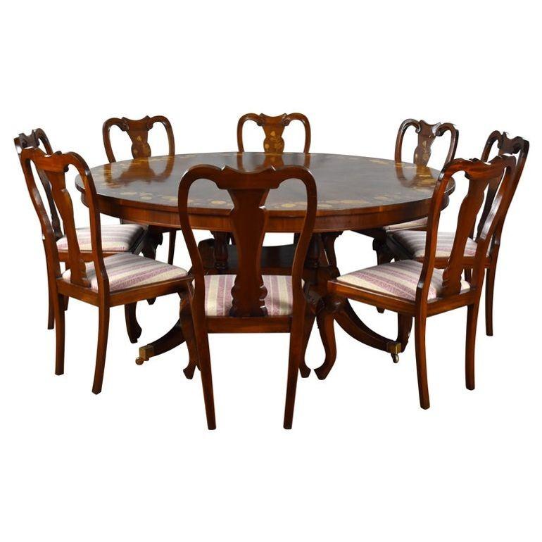 20th Century English Walnut & Marquetry Circular Dining Table & 8 Chairs