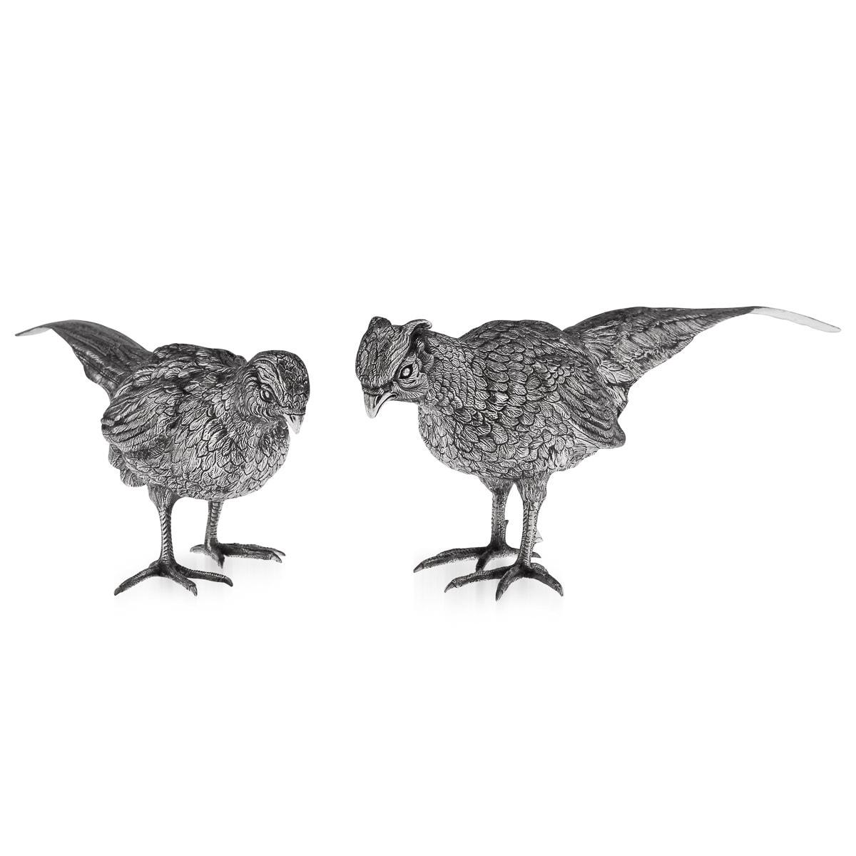 20th Century German Solid Silver Pair Of Pheasant Statues, Hanau, c.1910