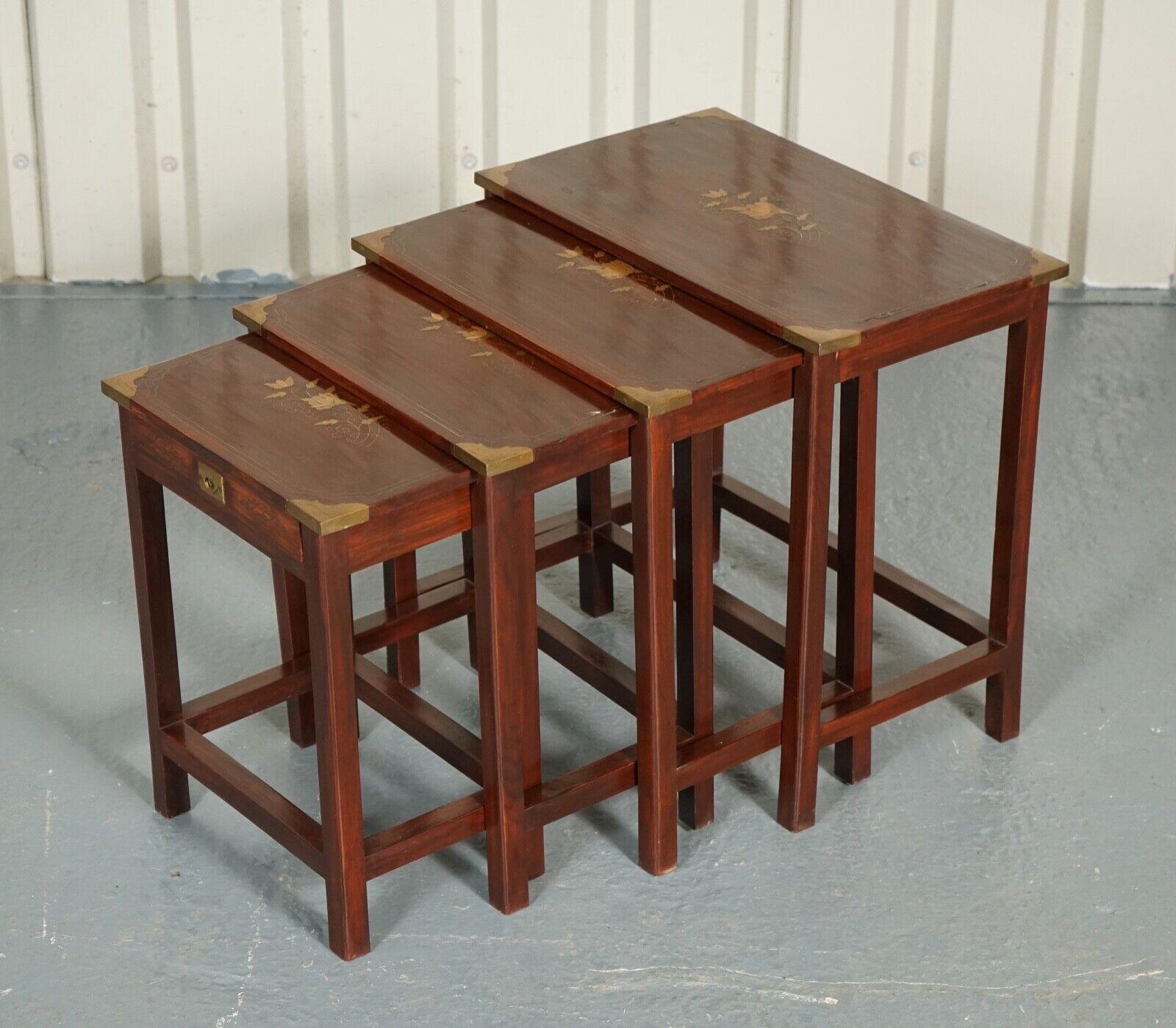20th Century Military Campaign Style Rosewood & Brass Inlay Nest of 4 Table