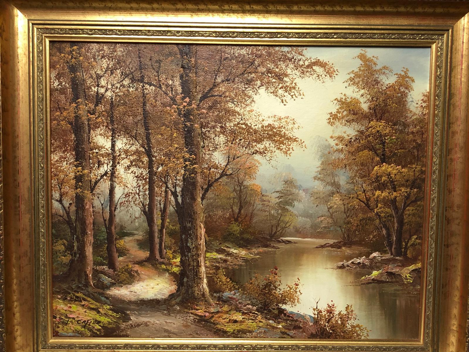 20th Century Oil Painting Landscape Forest River "View Through The Trees"