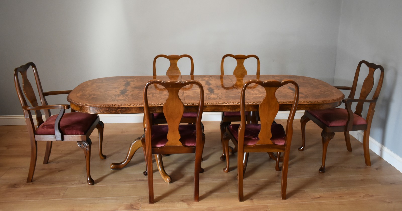 20th Century Queen Anne Style Burr Walnut Dining Table & 6 Chairs
