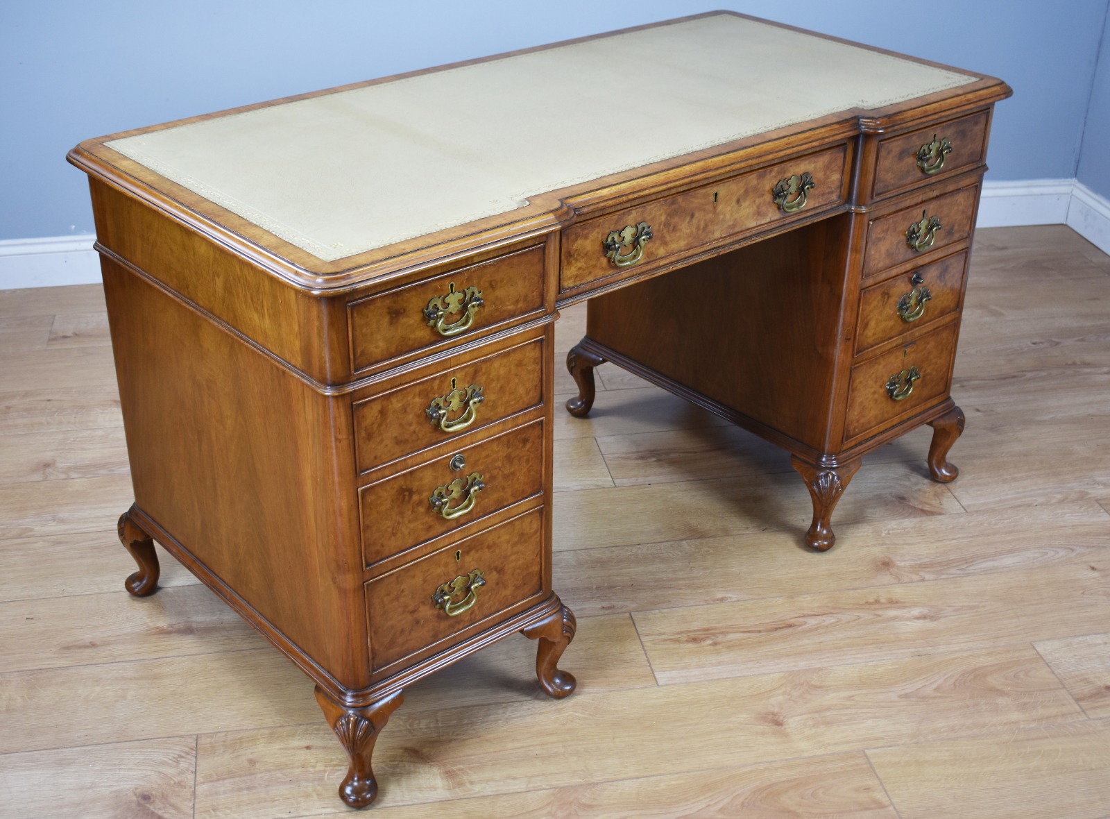 20th Century Queen Anne Style Burr Walnut Pedestal Desk