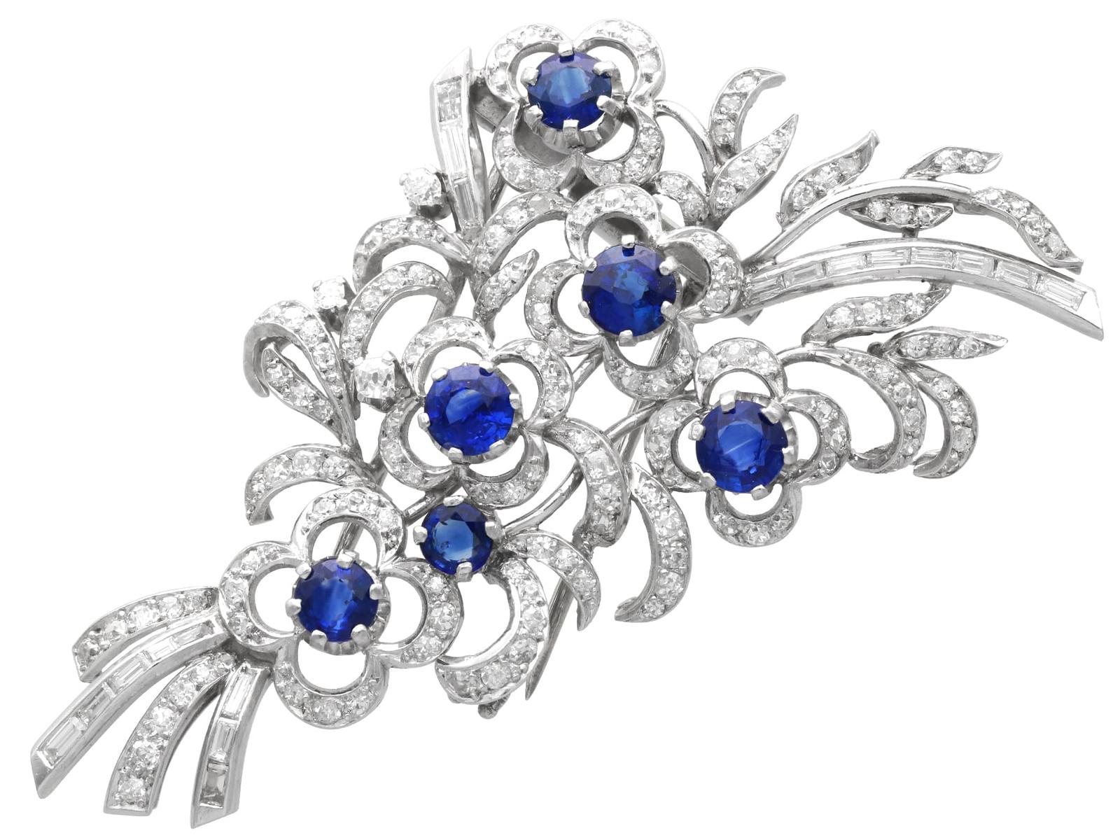 A stunning, fine and impressive antique 2.48 carat sapphire, 2.80 carat diamond, platinum and 18 karat white gold spray brooch; part of our antique sapphire brooch collection.