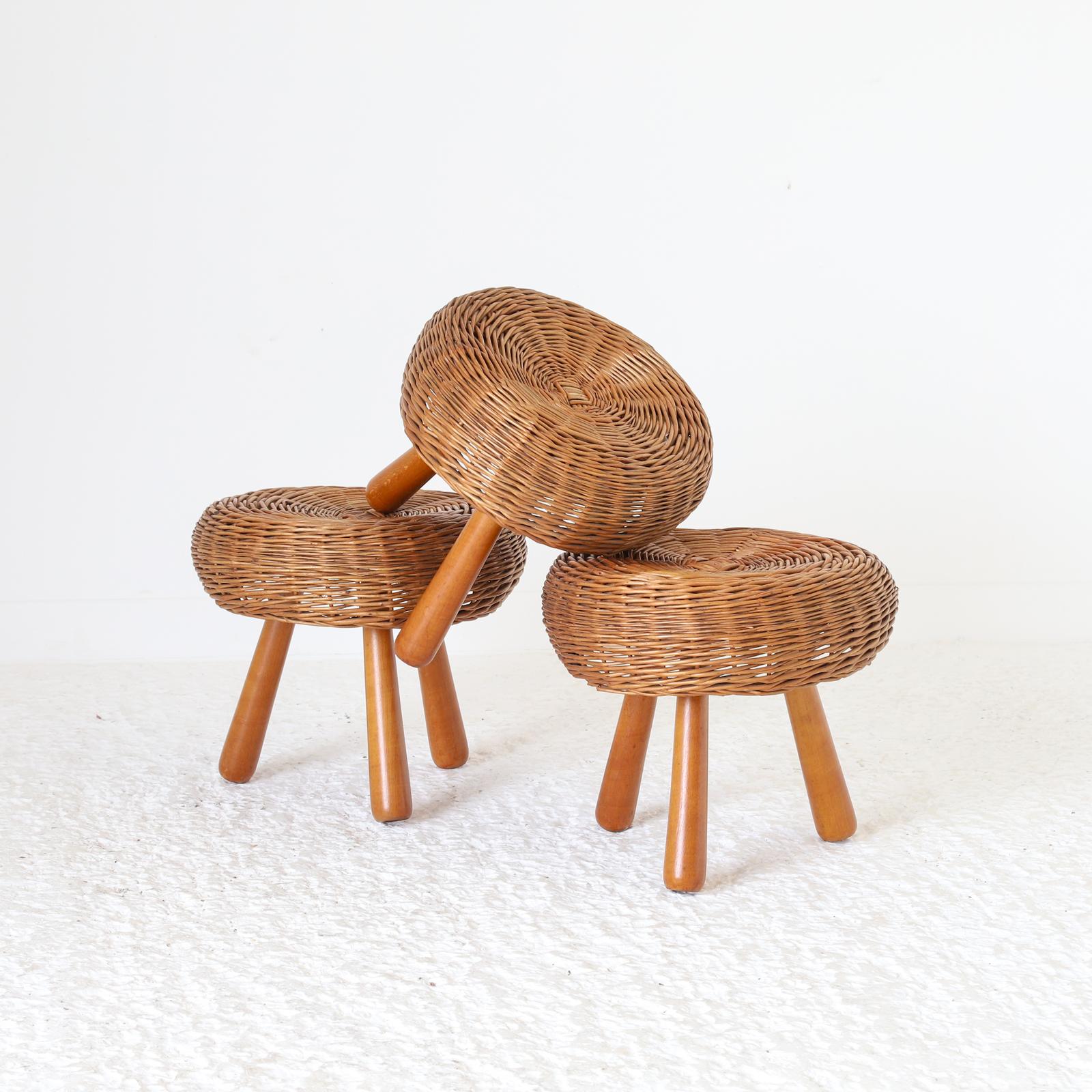 3 Mid Century Wicker & Beechwood Stools by USA Designer Tony Paul