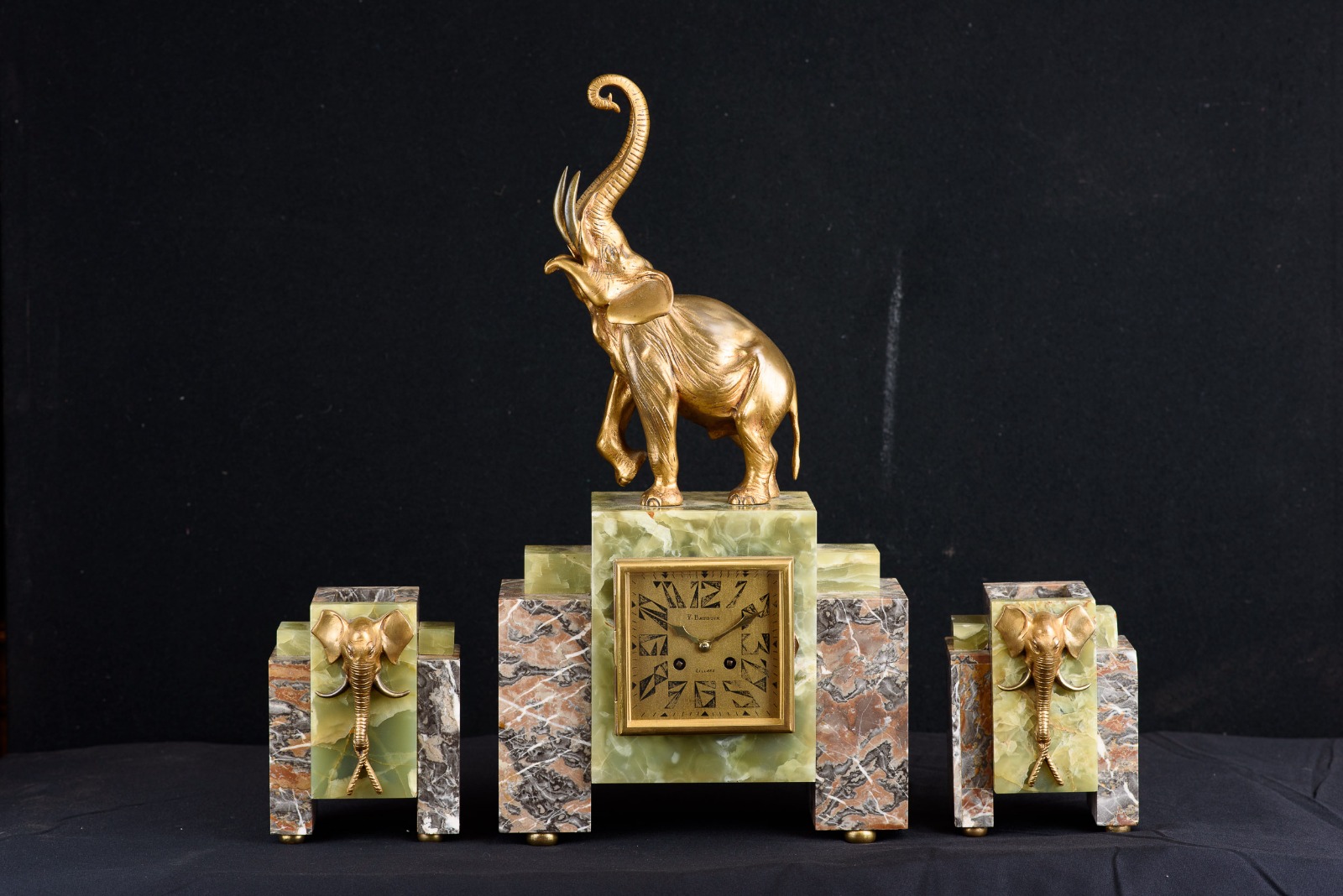 3 Piece Art Deco Mantle Clock Ormolu Elephant Marble