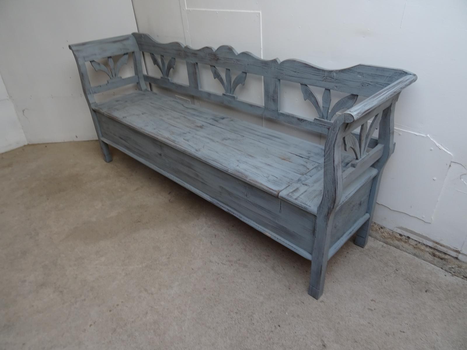 3/4 Seater Antique Pine Painted Light Grey / Blue Box Settle / Bench
