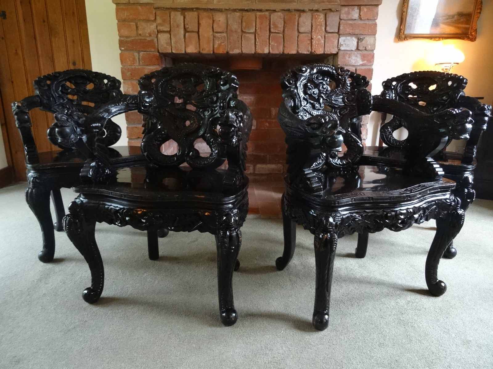 4 19th Century Period Antique Chinese Dragon Carved Padouk Armchairs - Table Available
