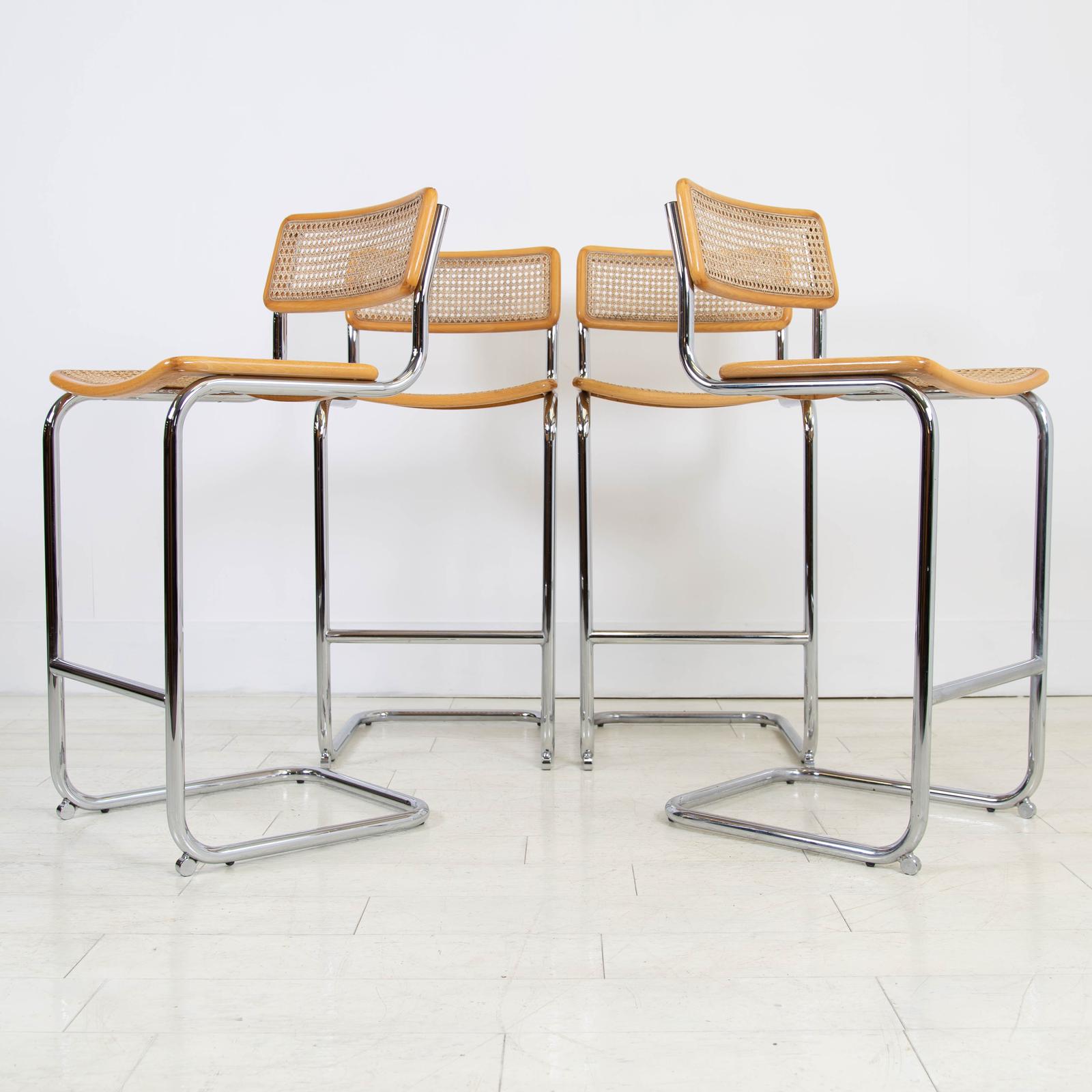 4 Marcel Breuer Style Cane & Chrome Bar Kitchen Stools by Cidue c.1970