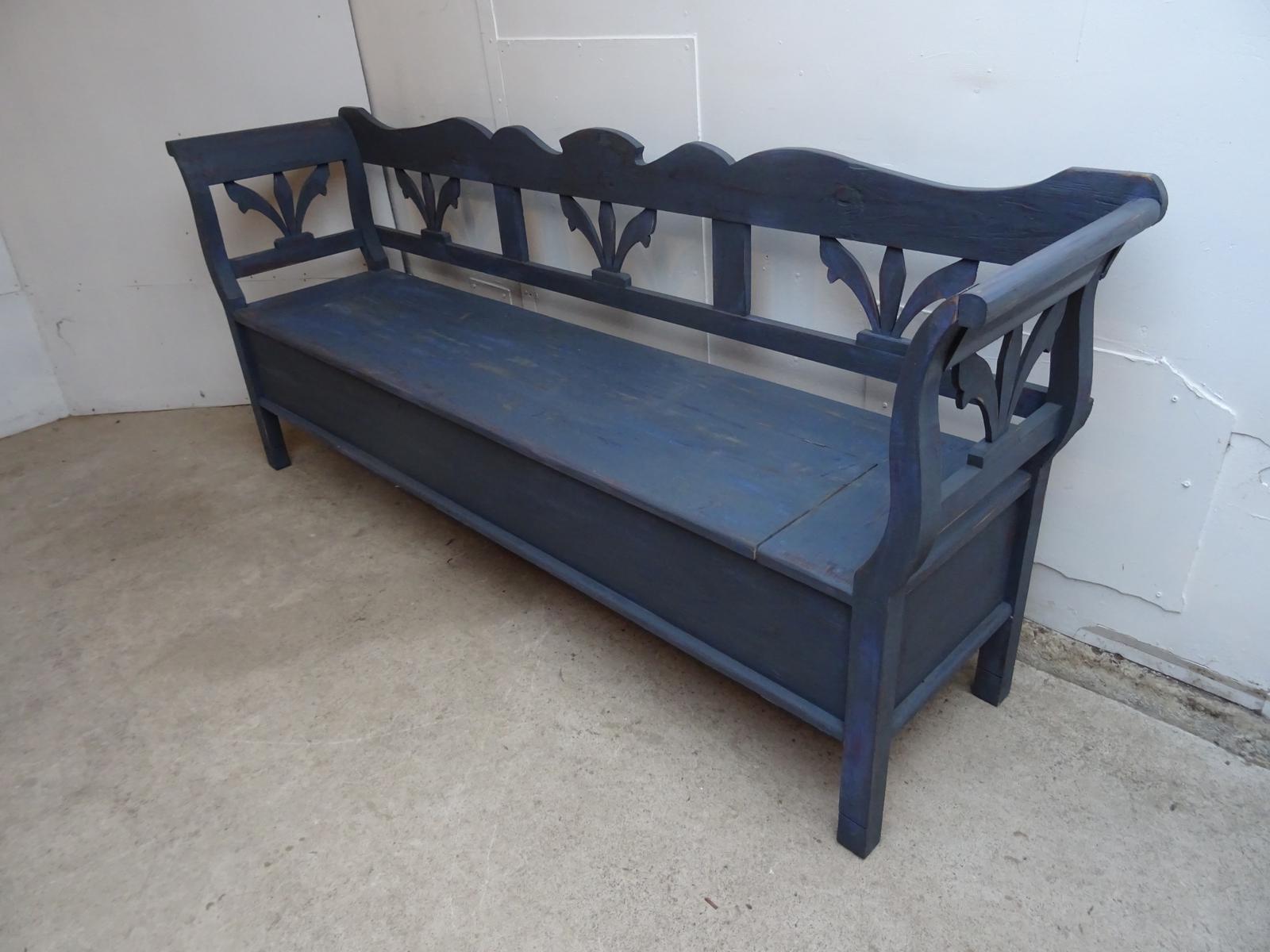 4 Seater Antique Pine Painted Battleship Grey / Blue Box Settle / Bench