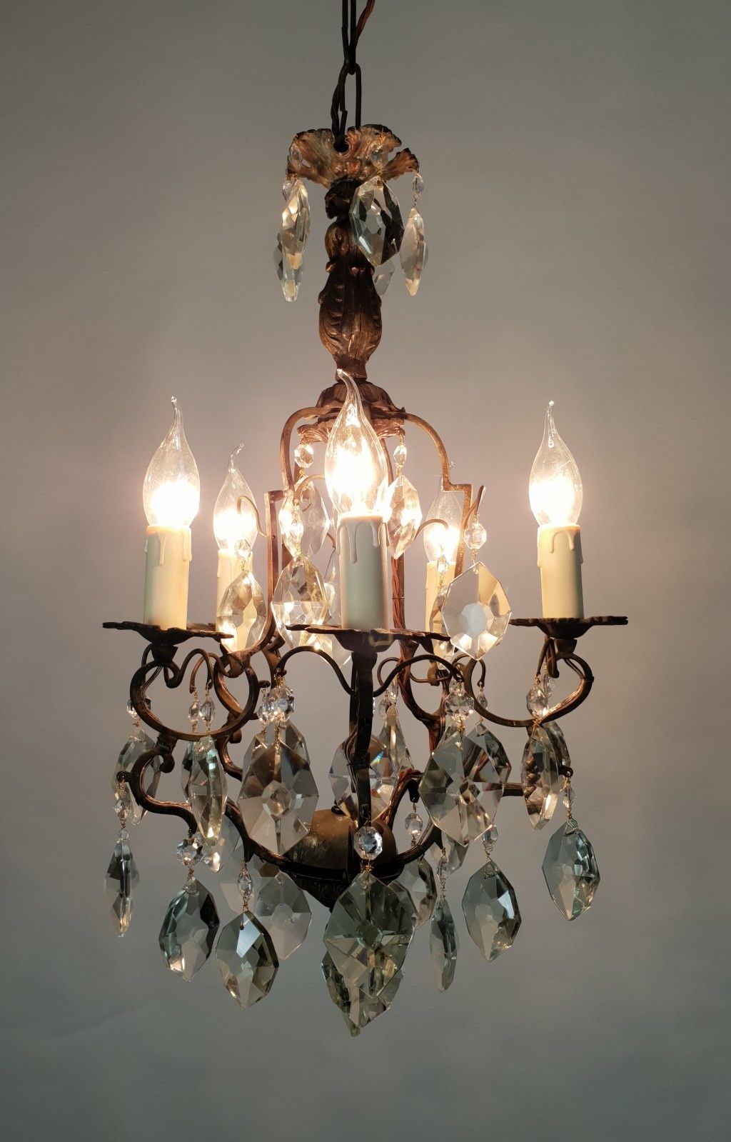5 Arm Gilt Brass Crystal Chandelier; Rewired, c.1910