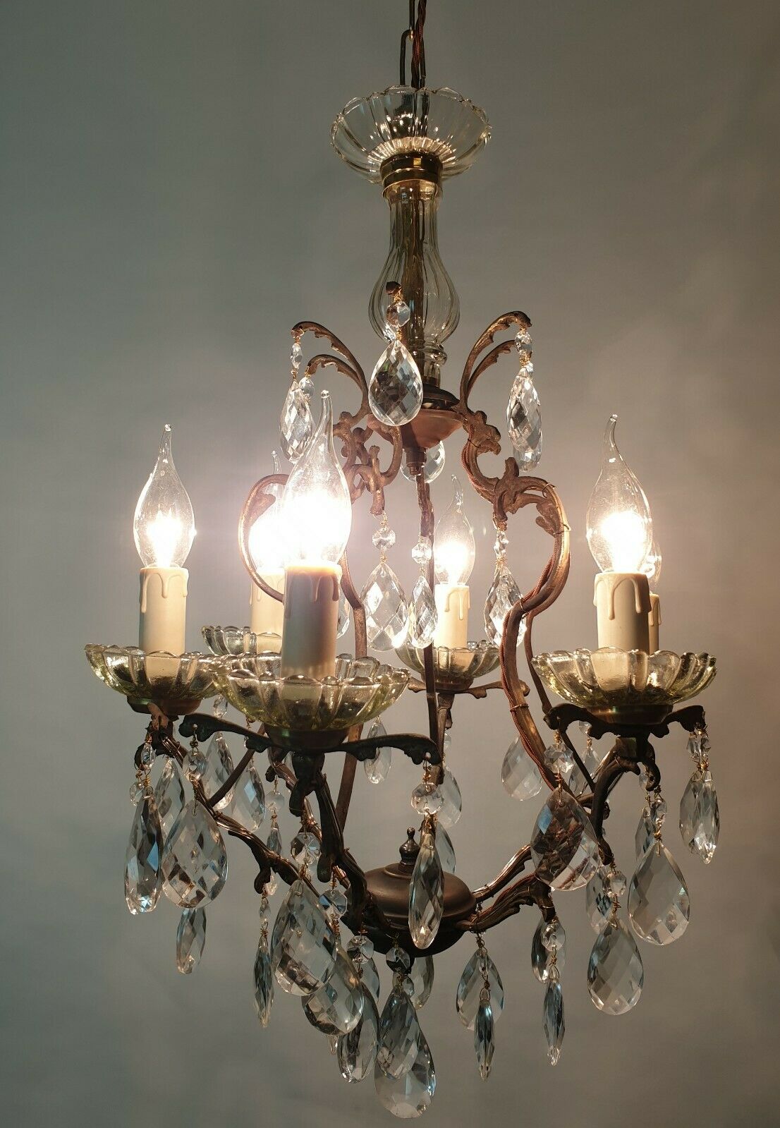 6 Arm Crystal & Aged Brass Chandelier, Rewired c.1910