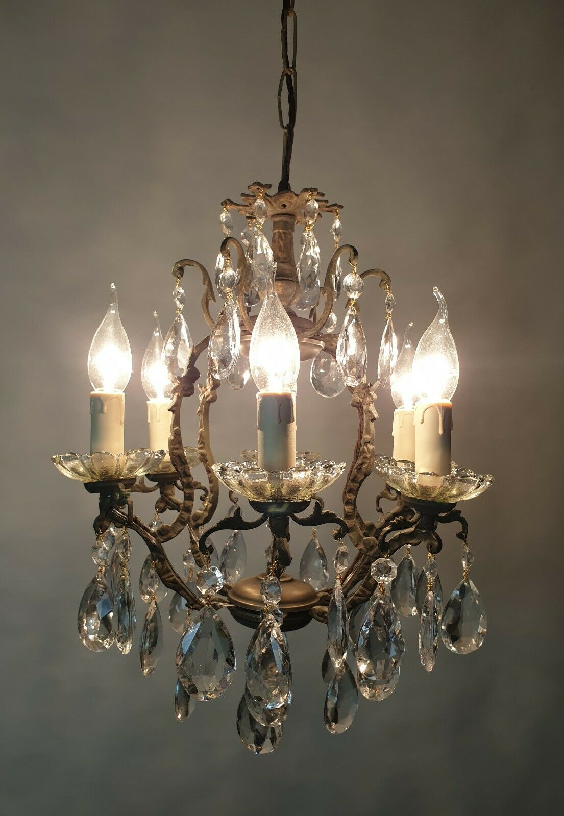 6 Arm Crystal & Aged Brass Chandelier, Rewired c.1910