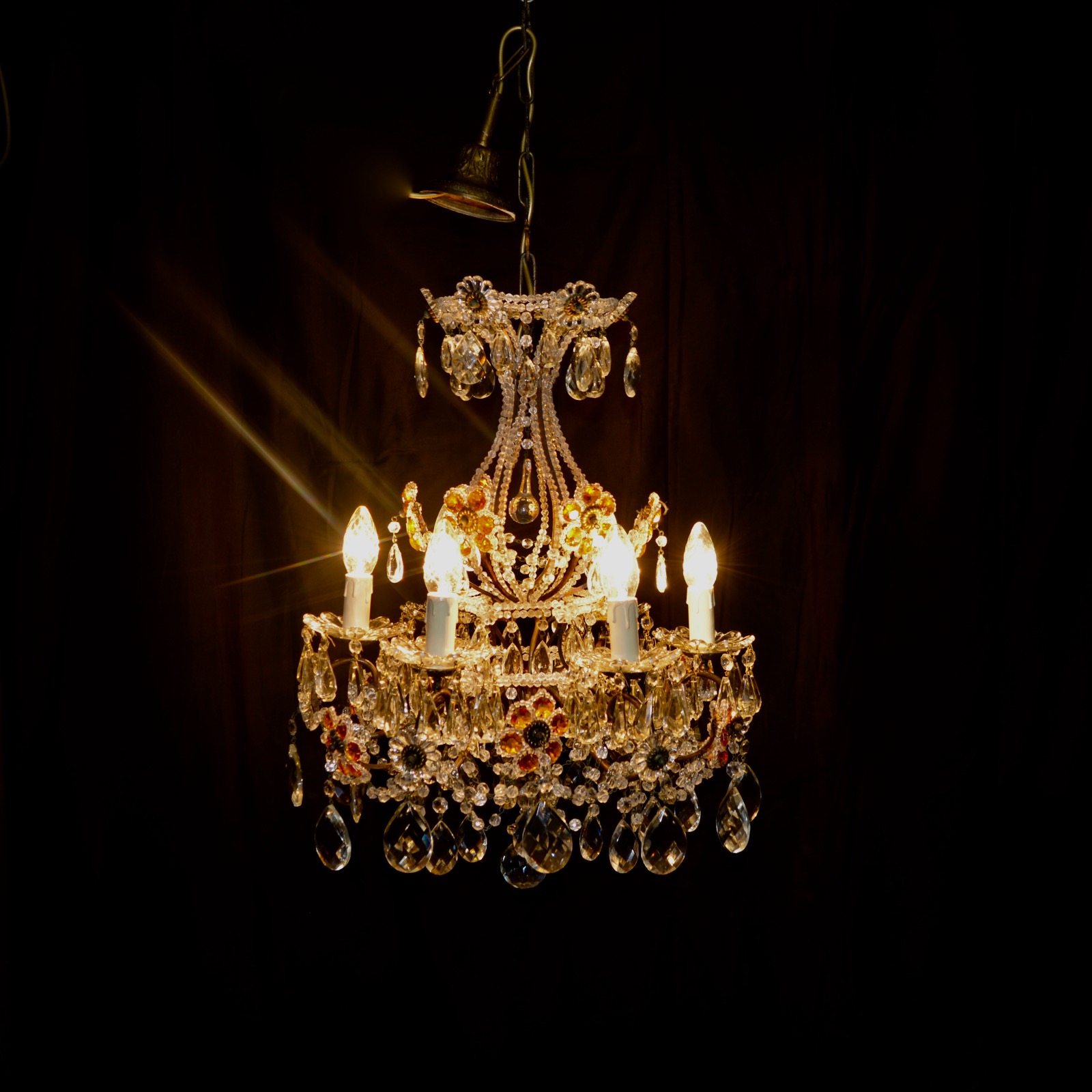 6 Lights Beaded Florentine Crystal Chandelier c.1950