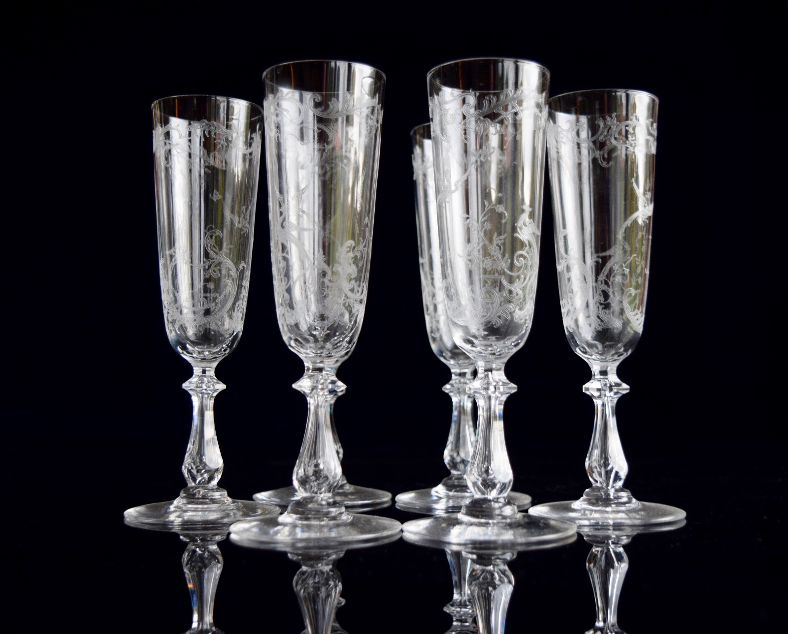 6 Val Saint Lambert Champagne Flutes Bird Motif c.1920