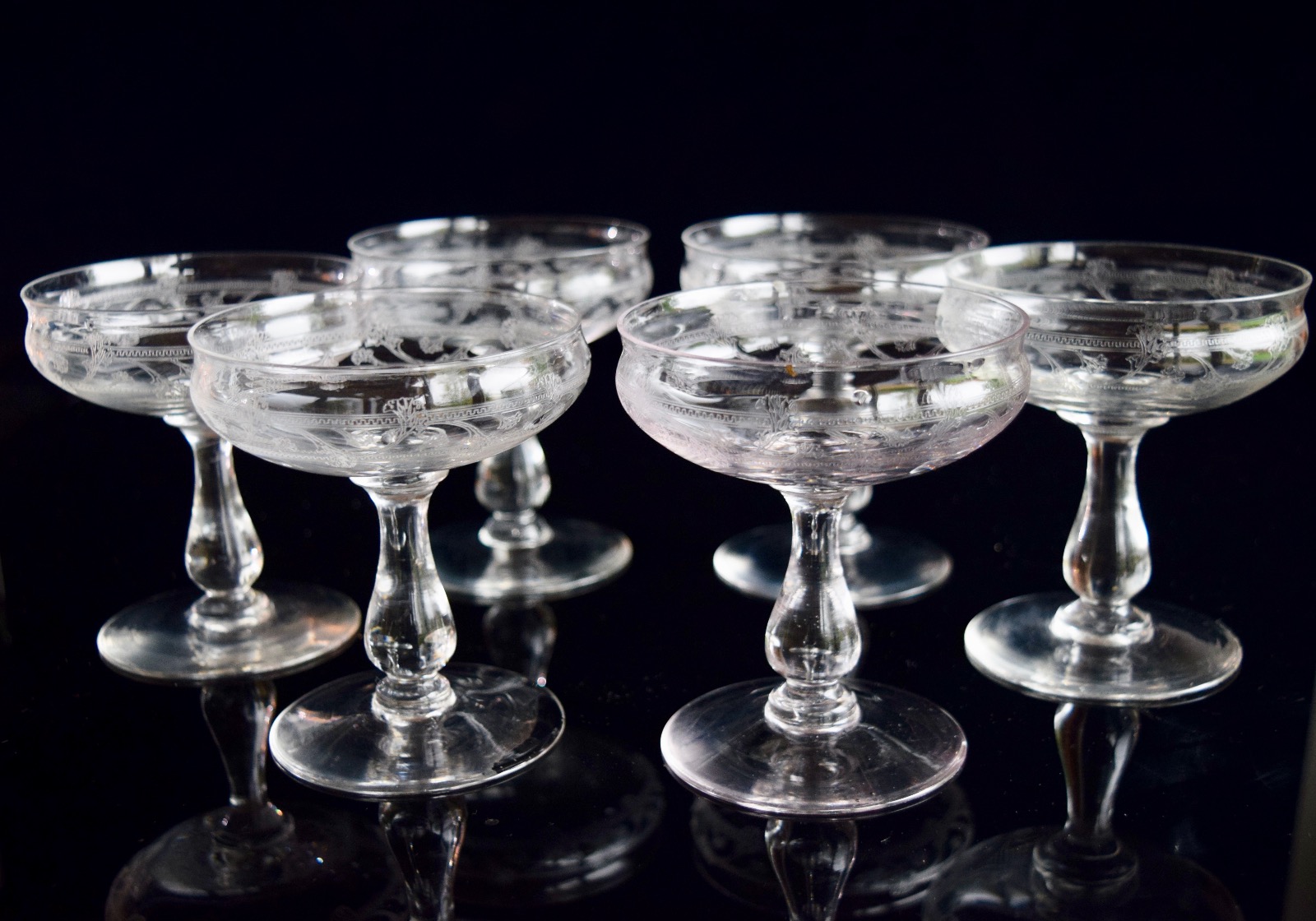 6 Val Saint Lambert Etched Champagne Glasses 1920-1930