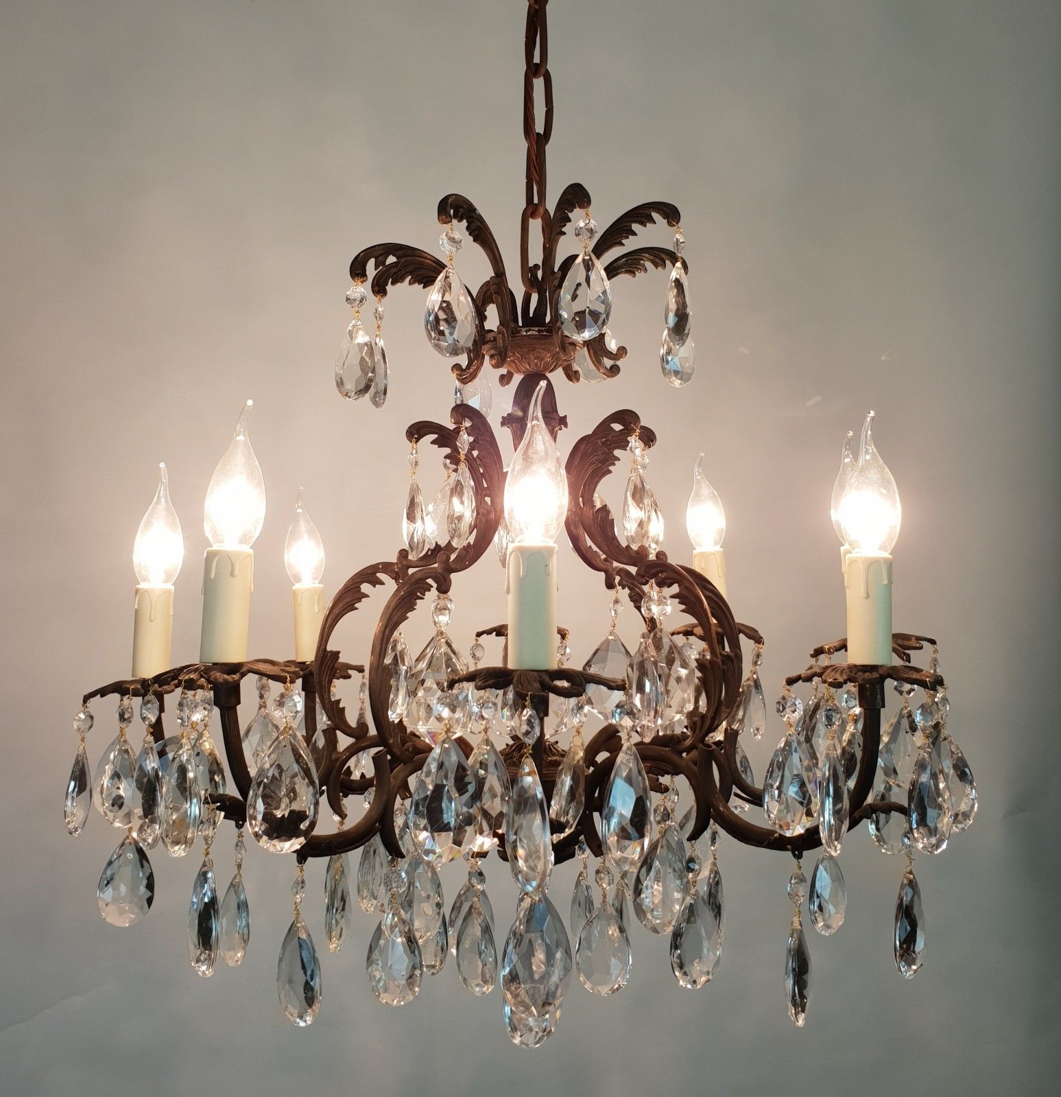 8 Arm Aged Brass Crystal Chandelier; Rewired, c.1910
