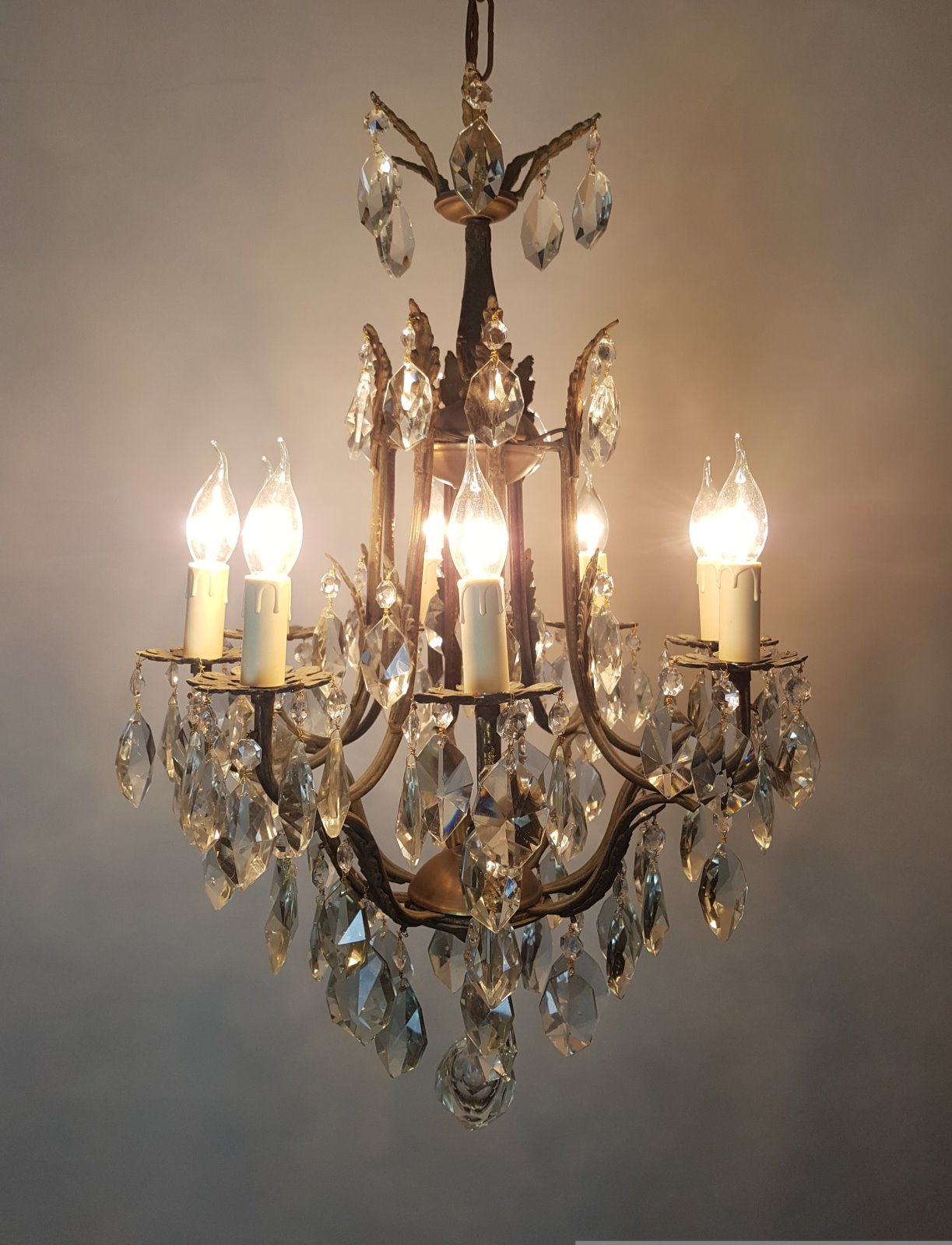 8 Arm Gilt Brass Birdcage Chandelier; Fully Rewired & Restored C.1910