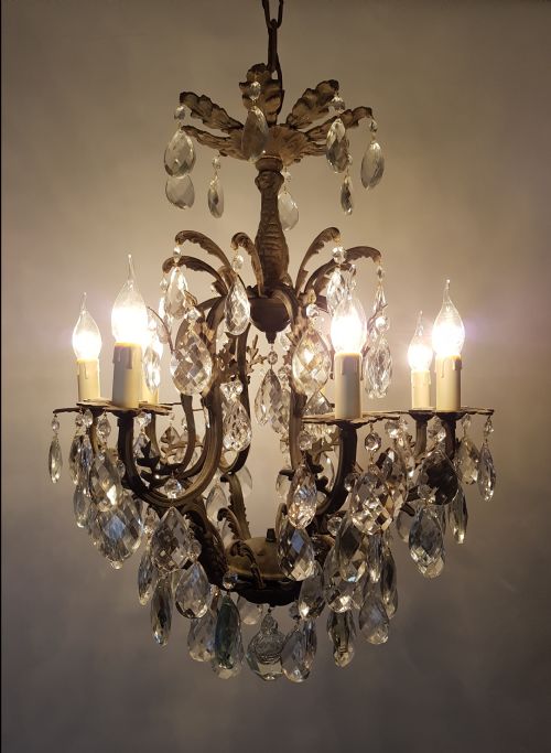 8 Arm Gilt Brass Crystal Birdcage Chandelier c.1900