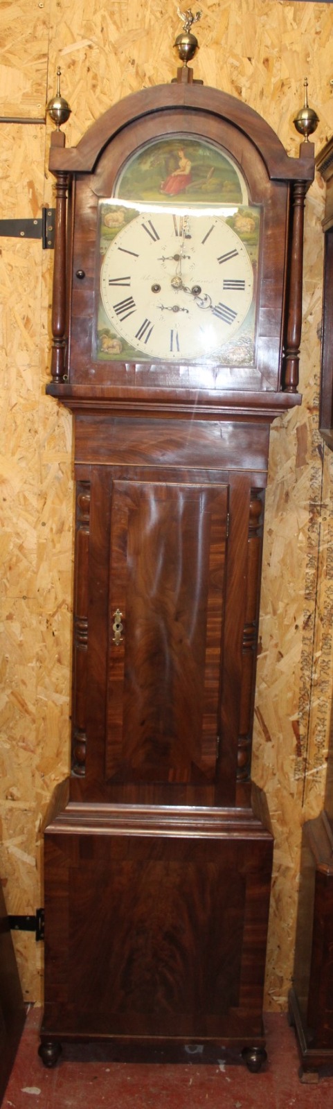 8 Day Mahogany Grandfather Clock Painted Face Country Scene c.1850