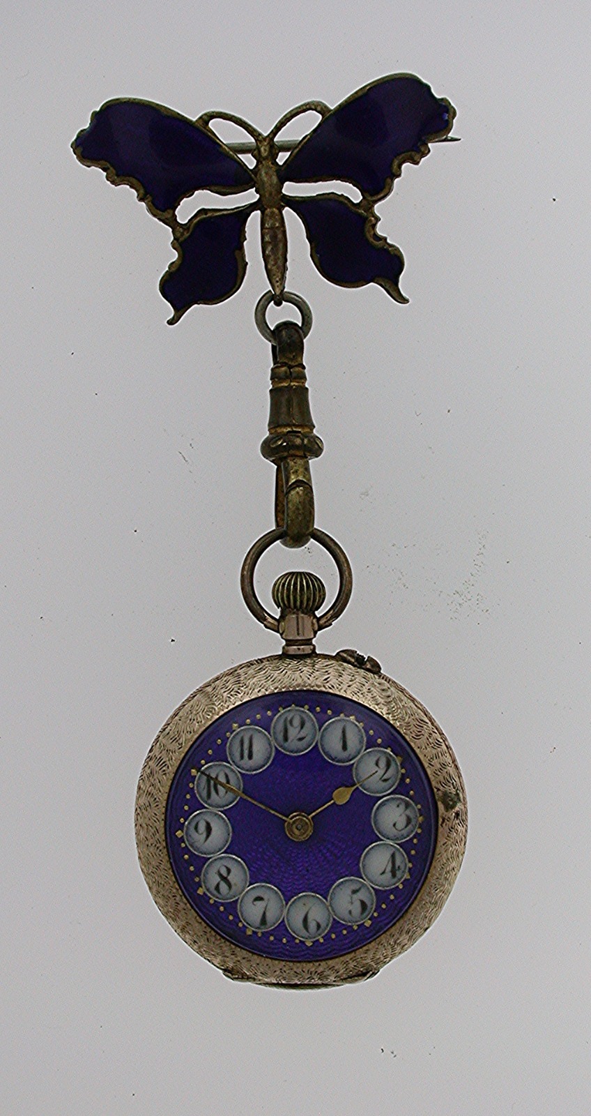 9 Kt Gold Ladies Open Face Fob Pocket Watch with Blue Enamel Butterfly Brooch 1890