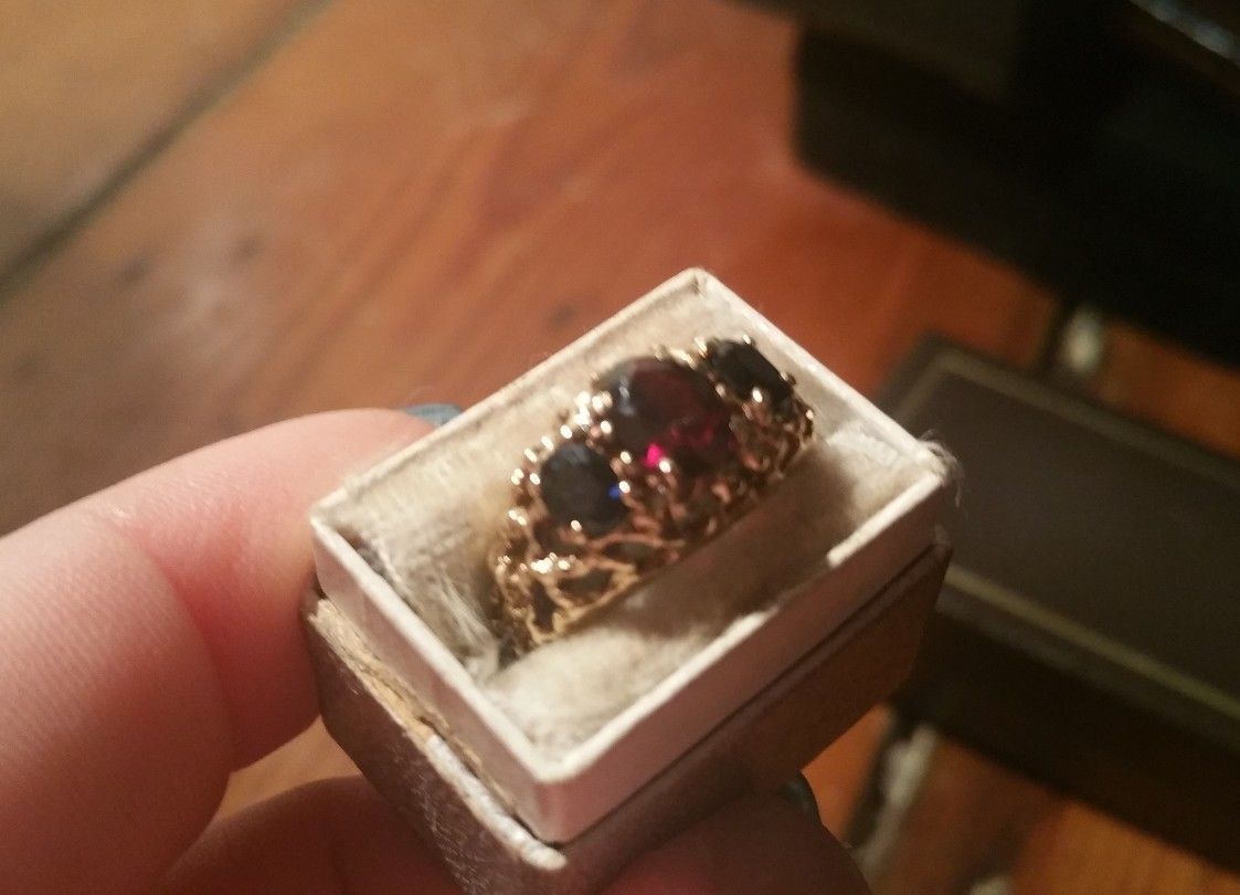 9ct 375 Solid Gold Gypsy Set with three Stone Garnet & Sapphire Ring