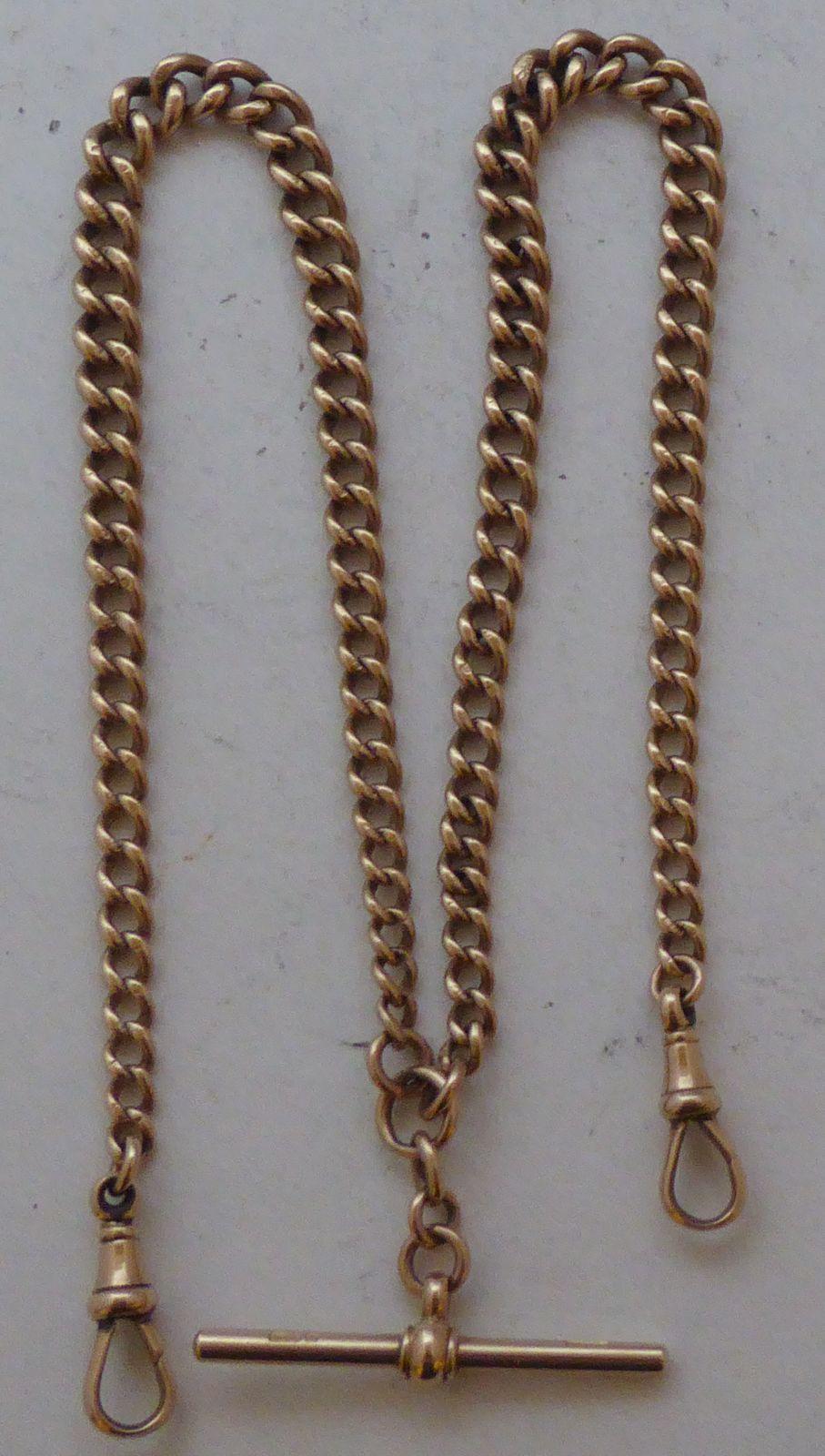9ct Gold Albert Watch Chain T Bar Twin Lobster Clips Necklace c.1903