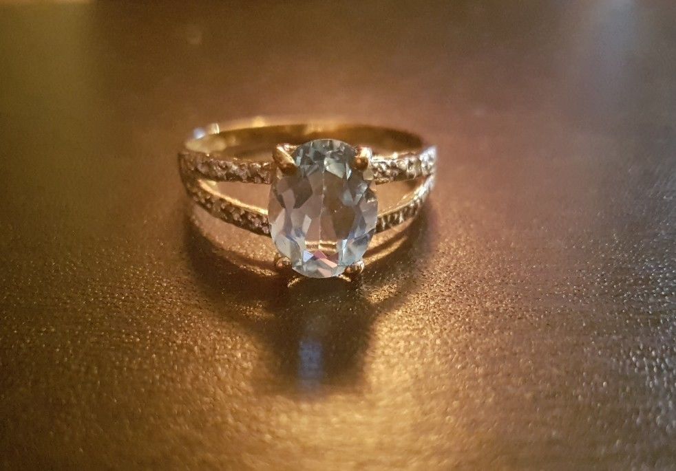 9ct Gold Genuine Aquamarine & Diamond Ring Size O