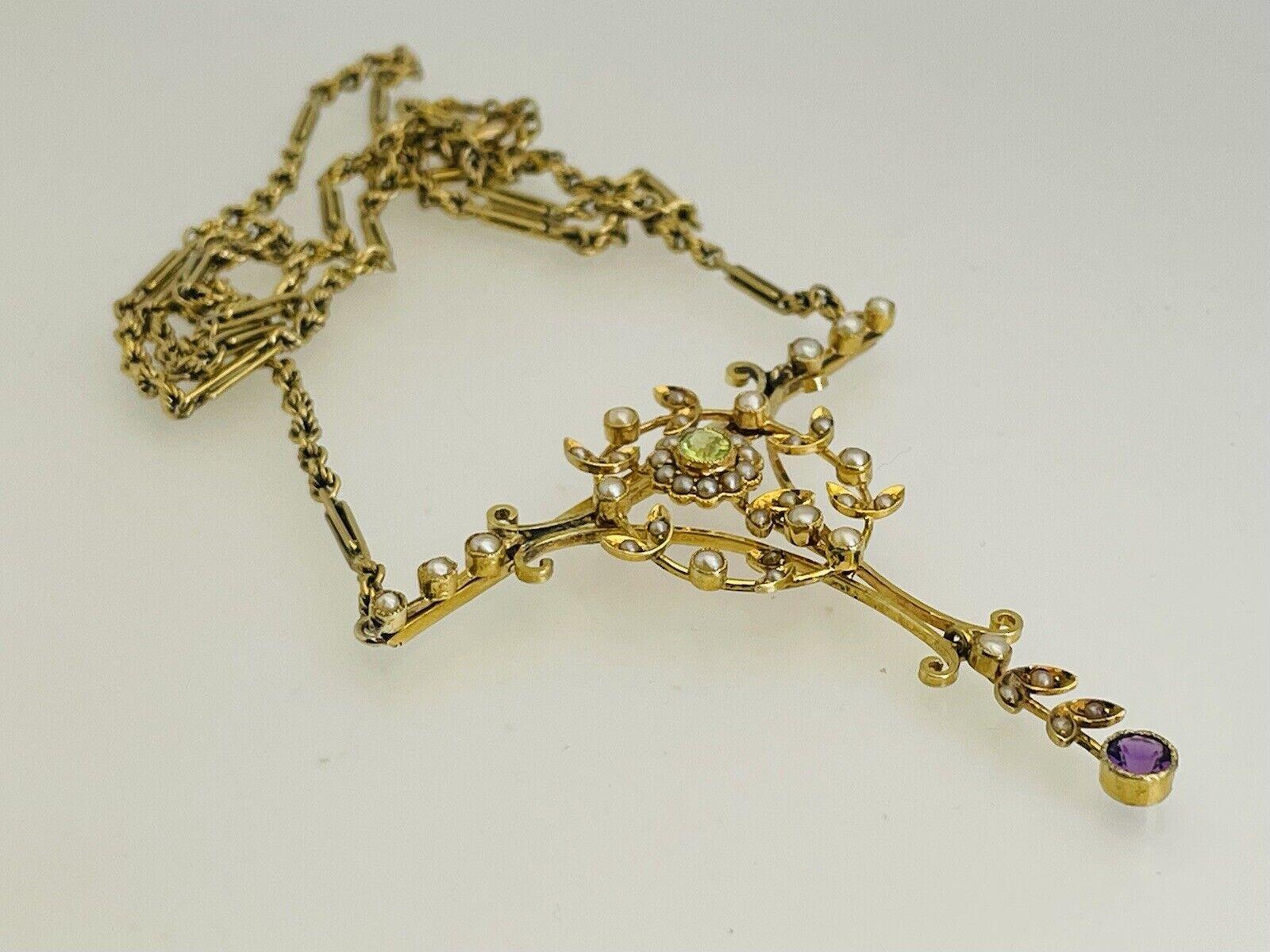 9ct Gold Pearl Peridot Amethyst Art Nouveau Suffragette 19 1/2" Bib Necklace