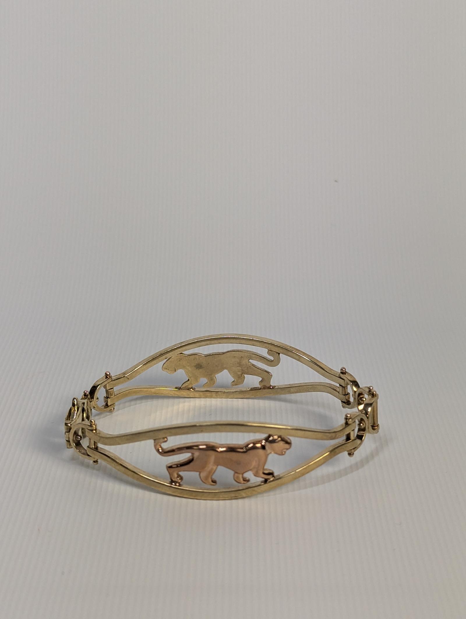 This vintage-inspired 9ct gold hinged bangle features a striking three-dimensional panther motif set within a wide, openwork yellow gold frame. Crafted in a classic tricolour style, the bracelet showcases panther silhouettes in contrasting shades of white and rose gold. The design is typical of bold 1980s and 1990s estate jewellery. For security, the piece is designed with a sturdy hinged mechanism and a discrete side clasp, making it a statement accessory that blends feline elegance with traditional gold craftsmanship. Full set of Hallmarks located on the clasp.